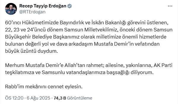 ANKARA, (DHA)- CUMHURBAŞKANI Recep Tayyip Erdoğan, Ankara'da vefat eden eski Bayındırlık ve İskan Bakanı Mustafa Demir için taziye mesajı paylaştı.Cumhurbaşkanı Erdoğan, sosyal medya hesabından paylaştığı mesajda, "60'ıncı hükümetimizde Bayındırlık ve İskan Bakanlığı görevini üstlenen, 22, 23 ve 24'üncü dönem Samsun Milletvekilimiz, önceki dönem Samsun Büyükşehir Belediye Başkanımız olarak milletimize önemli hizmetlerde bulunan değerli yol ve dava arkadaşım Mustafa Demir'in vefatından büyük üzüntü duydum. Merhum Mustafa Demir'e Allah'tan rahmet; ailesine, yakınlarına, AK Parti teşkilatımıza ve Samsunlu vatandaşlarımıza başsağlığı diliyorum. Rabb'im mekanını cennet eylesin" ifadelerini kullandı. (DHA)