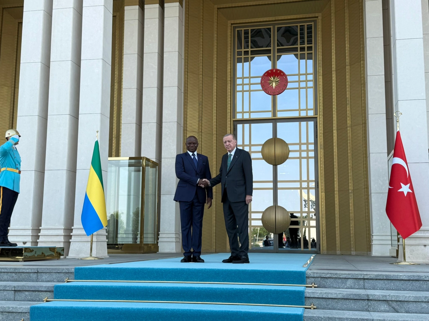 Aybala MELEK/ANKARA, (DHA)- CUMHURBAŞKANI Recep Tayyip Erdoğan, Gabon Cumhurbaşkanı Brice Clotaire Oligui Nguema'yı resmi törenle karşıladı.Cumhurbaşkanı Erdoğan, Gabon Cumhurbaşkanı Nguema'yı, Cumhurbaşkanlığı Külliyesi'nde resmi törenle karşıladı. Erdoğan ve Nguema'nın yerlerini almalarının ardından iki ülkenin milli marşları çalındı. Törende, Cumhurbaşkanlığı Muhafız Alayı tüfekli gösteri gerçekleştirdi. 16 Türk devletini temsil eden bayraklar ve askerlerin yer aldığı törende, 21 pare top atışı yapıldı. Ardından Nguema, Muhafız Alayı Tören Kıtası'nı 'Merhaba asker' diyerek selamladı. Daha sonra Cumhurbaşkanı Erdoğan ve Nguema, birbirlerine heyetlerini takdim etti. Cumhurbaşkanı Erdoğan ve Nguema, merdivenlerde Türkiye ve Gabon bayrakları önünde tokalaşarak basın mensuplarına poz verdi. Erdoğan ile Nguema, ikili görüşmelerinin ardından heyetler arası görüşme gerçekleştirecek ve ortak basın toplantısı düzenleyecek. Daha sonra Erdoğan, Nguema onuruna resmi akşam yemeği verecek. (DHA)