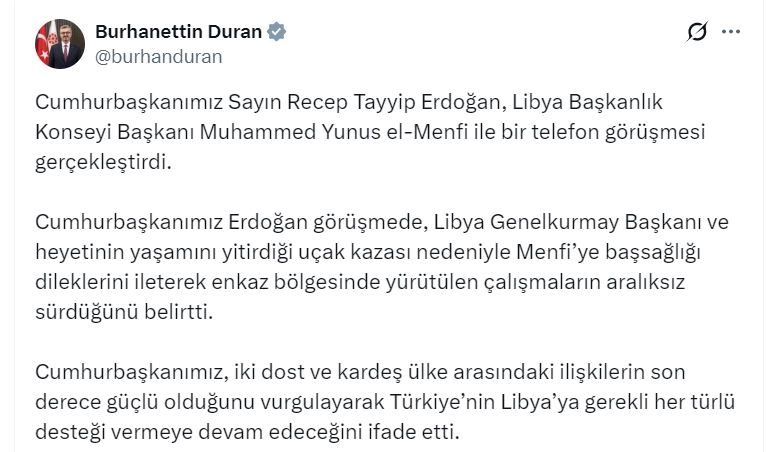 İletişim Başkanı Burhanettin Duran tarafından sosyal medya hesabından yapılan açıklamada, "Cumhurbaşkanımız Sayın Recep Tayyip Erdoğan, Libya Başkanlık Konseyi Başkanı Muhammed Yunus el-Menfi ile bir telefon görüşmesi gerçekleştirdi. Cumhurbaşkanımız Erdoğan görüşmede, Libya Genelkurmay Başkanı ve heyetinin yaşamını yitirdiği uçak kazası nedeniyle Menfi’ye başsağlığı dileklerini ileterek enkaz bölgesinde yürütülen çalışmaların aralıksız sürdüğünü belirtti. Cumhurbaşkanımız, iki dost ve kardeş ülke arasındaki ilişkilerin son derece güçlü olduğunu vurgulayarak Türkiye'nin Libya'ya gerekli her türlü desteği vermeye devam edeceğini ifade etti" dedi. (DHA)