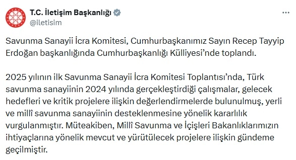 İLETİŞİM BAŞKANLIĞI’NDAN TOPLANTIYA İLİŞKİN AÇIKLAMASavunma Sanayii İcra Komitesi Toplantısı’nda ele alınan konular hakkında Cumhurbaşkanlığı İletişim Başkanlığı tarafından sosyal medya hesabı üzerinden açıklama yapıldı. Açıklamada, 2025 yılının ilk Savunma Sanayii İcra Komitesi Toplantısı’nda, Türk savunma sanayiinin 2024 yılında gerçekleştirdiği çalışmalar, gelecek hedefleri ve kritik projelere ilişkin değerlendirmelerde bulunulduğu, yerli ve milli savunma sanayiinin desteklenmesine yönelik kararlılığın vurgulandığı kaydedildi. TEDARİK PROJELERİ GÖRÜŞÜLEREK KARARA BAĞLANDIMilli Savunma ve İçişleri bakanlıklarının ihtiyaçlarına yönelik mevcut ve yürütülecek projeler hakkında bilgilerin yer aldığı açıklamada, "Toplantı kapsamında; sürü yetenekli kamikaze insansız hava ve deniz araçları projeleri, geleceğin savaş/harekat ortamlarında insansız savaş uçaklarının önemli görevler icra edeceği değerlendirmesinden hareketle hava-hava, hava-yer taarruz ve hava savunma baskısı görevlerinin gerçekleştirilmesi amacıyla insansız savaş uçağı projesi, alçak, orta ve yüksek irtifa hava savunma sistemleri seri üretim projeleri, ülkemizin vurucu gücünü artıran uzun menzilli füze sistemleri seri üretim projeleri, kuvvet çarpanı etkisi oluşturacak füze geliştirme projeleri, gelişmiş hava savunma kabiliyetlerine sahip olacak TF-2000 Hava Savunma Harbi Muhribi projesi, kendi denizaltısını tasarlayıp üretebilen sayılı ülkeler arasına girmemizi sağlayacak Milli Denizaltı (MİLDEN) projesi, ülkemizin uzaya bağımsız erişim yeteneğinin artırılması projeleri, ilave hafif sınıf genel maksat helikopteri ihtiyacının karşılanması için T625 GÖKBEY Helikopteri seri üretim projesi, elektronik harp yeteneğinin artırılmasına yönelik tedarik ve geliştirme projeleri, kritik tesislerimizi ve bölgelerimizi İHA tehdidine karşı koruma projeleri, ilave silahlı insansız hava araçları ve ilgili alt sistem ihtiyaçlarına yönelik tedarik projeleri, zırhlı personel taşıyıcı ve kurtarma araçları ile muhtelif kara araçları tedarik projeleri, kamikaze kara araçları projeleri, muhtelif simülatör ve elektro-optik sistemlerin tedarik projeleri görüşülerek karara bağlanmıştır" denildi.Açıklamanın devamında, toplantıda milletin ve devletin güçlü desteğiyle Türk savunma sanayiinde elde edilen başarılardan duyulan memnuniyet ifade edilerek, 2025 yılında daha da yüksek gayret ile çalışmaların sürdürülmesinin gerekliliğinin vurgulandığı, yerli ve milli teknolojiler kullanılarak savunma sanayiindeki örnek teşkil eden gelişimin azim ve kararlılıkla sürdürüleceğinin ifade edildiği kaydedildi. (DHA)