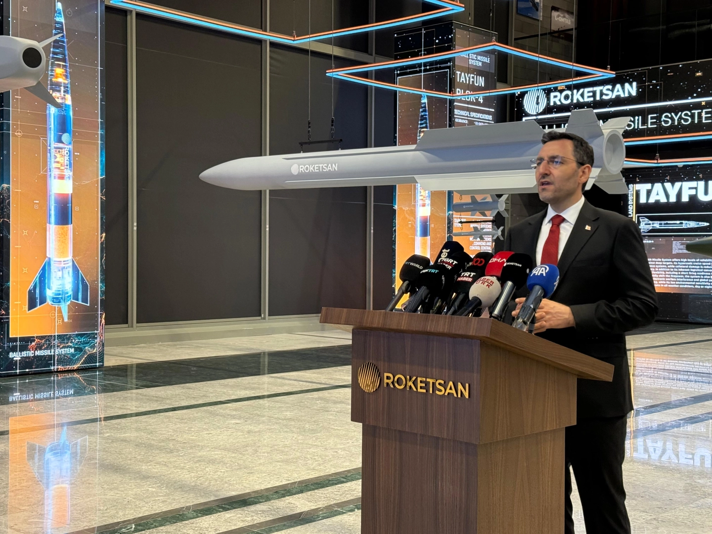 ROKETSAN Genel Müdürü Murat İkinci, ROKETSAN Üretim Tesisleri Açılışı, Seri Üretim Teslimatları ve Temel Atma Töreni'nin ardından, basın mensuplarına açıklama yaptı. ROKETSAN Genel Müdürü İkinci, kendileri için tarihi günlerden bir tanesinin yaşandığını ifade ederek, "Kırıkkale’deki yakıt üretim tesisimiz 25 bin dönüm arazi üzerinde çok büyük bir teknoloji kompleksi. Türkiye’nin yakıt üretim kapasitesini 5 katına çıkartan bir yatırım. Toplam bedeli 450 milyon dolar seviyesinde. Yine bununla beraber bugün Avrupa’nın en büyük harp başlığı tesisini hizmete açtık. Çalışmaya başladık. Bu harp başlığı tesisinde tank savarlar dahil TAYFUN balistik füzemizin harp başlığı dahil penetrasyon harp başlıklar dahil birçok harp başlığını üretebileceğimiz tesis alt yapısına kavuşturulmuş olduk ülkemizi. Bugün önemli yatırımlarımızdan bir tanesi de şu an içinde bulunmuş olduğumuz teknoloji AR-GE merkezimiz. Burada yaklaşık 1000 kişilik ARGE ekibimizin çalışmasına olanak tanıyan AR-GE merkezimizin de açılışını yaptık. Burası sadece bir çalışma alanı değil. Aynı zamanda AR-GE’yi yapabileceğimiz laboratuvar altyapısının da geliştirildiği bir alan. Bu üç büyük tesisimizle beraber bugün ilk defa altyapısını yapacağımız temel atma törenini gerçekleştirdiğimiz hava savunma ve balistik füze üretim tesisimizin de temel atma törenini hep beraber gerçekleştirdik. Bu tesis de 72 bin metrekare kapalı alana sahip olacak ve şu anda bizim mevcut olan kapasitemizi nihai entegrasyon kapasitemizi kat be kat arttıracak" dedi.