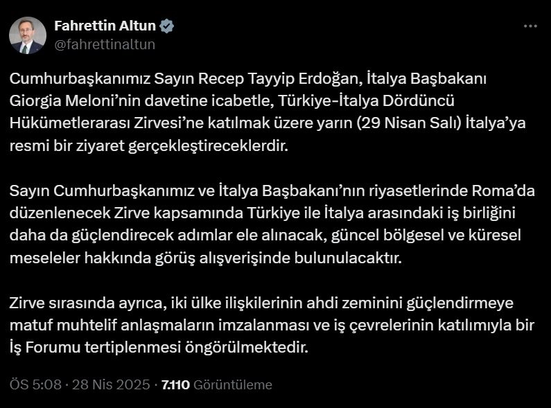 Aybala MELEK/ANKARA, (DHA)- İLETİŞİM Başkanı Fahrettin Altun, Cumhurbaşkanı Recep Tayyip Erdoğan'ın, 'Türkiye-İtalya Dördüncü Hükümetlerarası Zirvesi'ne katılmak üzere yarın İtalya'ya resmi bir ziyaret gerçekleştireceğini duyurdu.İletişim Başkanı Fahrettin Altun, sosyal medya hesabından yaptığı açıklamada, "Cumhurbaşkanımız Sayın Recep Tayyip Erdoğan, İtalya Başbakanı Giorgia Meloni’nin davetine icabetle, Türkiye-İtalya Dördüncü Hükümetlerarası Zirvesi’ne katılmak üzere yarın (29 Nisan Salı) İtalya’ya resmi bir ziyaret gerçekleştireceklerdir. Sayın Cumhurbaşkanımız ve İtalya Başbakanı’nın riyasetlerinde Roma’da düzenlenecek Zirve kapsamında Türkiye ile İtalya arasındaki iş birliğini daha da güçlendirecek adımlar ele alınacak, güncel bölgesel ve küresel meseleler hakkında görüş alışverişinde bulunulacaktır. Zirve sırasında ayrıca, iki ülke ilişkilerinin ahdi zeminini güçlendirmeye matuf muhtelif anlaşmaların imzalanması ve iş çevrelerinin katılımıyla bir İş Forumu tertiplenmesi öngörülmektedir" dedi. (DHA)