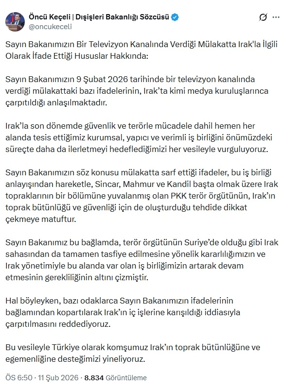 Keçeli, sanal medya hesabından, Dışişleri Bakanı Hakan Fidan'ın 9 Şubat'ta bir televizyon kanalına verdiği mülakatta Irak'la ilgili olarak ifade ettiği hususlar hakkında açıklama yaptı. Keçeli, "Sayın Bakanımızın 9 Şubat 2026 tarihinde bir televizyon kanalında verdiği mülakattaki bazı ifadelerinin, Irak’ta kimi medya kuruluşlarınca çarpıtıldığı anlaşılmaktadır. Irak’la son dönemde güvenlik ve terörle mücadele dahil hemen her alanda tesis ettiğimiz kurumsal, yapıcı ve verimli iş birliğini önümüzdeki süreçte daha da ilerletmeyi hedeflediğimizi her vesileyle vurguluyoruz. Sayın Bakanımızın söz konusu mülakatta sarf ettiği ifadeler, bu iş birliği anlayışından hareketle, Sincar, Mahmur ve Kandil başta olmak üzere Irak topraklarının bir bölümüne yuvalanmış olan PKK terör örgütünün, Irak’ın toprak bütünlüğü ve güvenliği için de oluşturduğu tehdide dikkat çekmeye matuftur. Sayın Bakanımız bu bağlamda, terör örgütünün Suriye’de olduğu gibi Irak sahasından da tamamen tasfiye edilmesine yönelik kararlılığımızın ve Irak yönetimiyle bu alanda var olan iş birliğimizin artarak devam etmesinin gerekliliğinin altını çizmiştir. Hal böyleyken, bazı odaklarca Sayın Bakanımızın ifadelerinin bağlamından kopartılarak Irak’ın iç işlerine karışıldığı iddiasıyla çarpıtılmasını reddediyoruz. Bu vesileyle Türkiye olarak komşumuz Irak’ın toprak bütünlüğüne ve egemenliğine desteğimizi yineliyoruz" ifadelerini kullandı. (DHA)