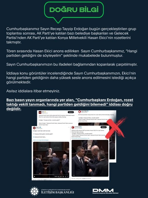 ANKARA, (DHA)- CUMHURBAŞKANLIĞI İletişim Başkanlığı Dezenformasyonla Mücadele Merkezi (DMM), "Bazı basın yayın organlarında yer alan, 'Cumhurbaşkanı Erdoğan, rozet taktığı vekili tanımadı, hangi partiden geldiğini bilemedi' iddiası doğru değildir. Tören sırasında Hasan Ekici anons edilirken Sayın Cumhurbaşkanımız, 'Hangi partiden geldiğini de söyleyelim' şeklinde mukabelede bulunmuştur" denildi.DMM’nin sosyal medya hesabından yapılan açıklamada, "Bazı basın yayın organlarında yer alan, 'Cumhurbaşkanı Erdoğan, rozet taktığı vekili tanımadı, hangi partiden geldiğini bilemedi' iddiası doğru değildir. Cumhurbaşkanımız Sayın Recep Tayyip Erdoğan bugün gerçekleştirilen grup toplantısı sonrası, AK Parti'ye katılan bazı belediye başkanları ve Gelecek Partisi'nden AK Parti'ye katılan Konya Milletvekili Hasan Ekici'nin rozetlerini takmıştır. Tören sırasında Hasan Ekici anons edilirken Sayın Cumhurbaşkanımız, 'Hangi partiden geldiğini de söyleyelim' şeklinde mukabelede bulunmuştur. Sayın Cumhurbaşkanımızın bu ifadeleri bağlamından koparılarak çarpıtılmıştır. İddiaya konu görüntüler incelendiğinde Sayın Cumhurbaşkanımızın, Ekici’nin hangi partiden geldiğinin daha yüksek sesle anons edilmesini istediği açıkça görülmektedir" ifadelerine yer verildi. (DHA)