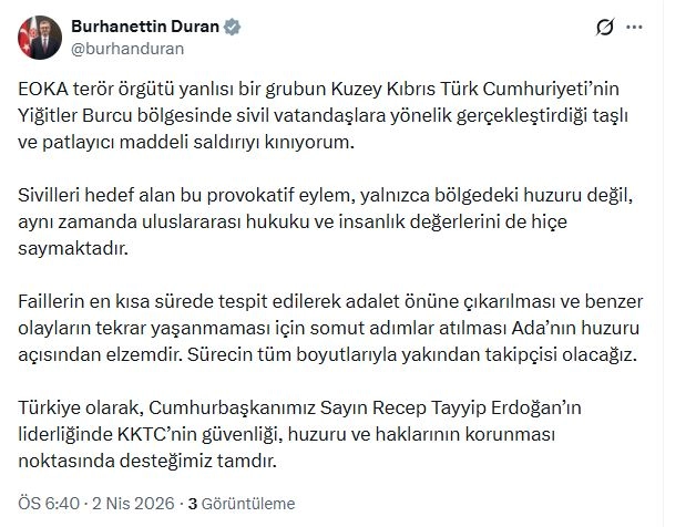 İletişim Başkanı Duran, sanal medya hesabı üzerinden yayımladığı kınama mesajında, “EOKA terör örgütü yanlısı bir grubun Kuzey Kıbrıs Türk Cumhuriyeti’nin Yiğitler Burcu bölgesinde sivil vatandaşlara yönelik gerçekleştirdiği taşlı ve patlayıcı maddeli saldırıyı kınıyorum. Sivilleri hedef alan bu provokatif eylem, yalnızca bölgedeki huzuru değil, aynı zamanda uluslararası hukuku ve insanlık değerlerini de hiçe saymaktadır. Faillerin en kısa sürede tespit edilerek adalet önüne çıkarılması ve benzer olayların tekrar yaşanmaması için somut adımlar atılması Ada’nın huzuru açısından elzemdir. Sürecin tüm boyutlarıyla yakından takipçisi olacağız. Türkiye olarak, Cumhurbaşkanımız Sayın Recep Tayyip Erdoğan’ın liderliğinde KKTC’nin güvenliği, huzuru ve haklarının korunması noktasında desteğimiz tamdır” ifadelerine yer verdi. (DHA)