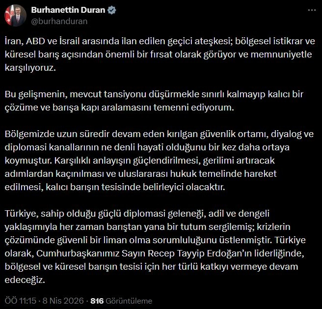 ANKARA, (DHA)- İLETİŞİM Başkanı Burhanettin Duran, "İran, ABD ve İsrail arasında ilan edilen geçici ateşkesi; bölgesel istikrar ve küresel barış açısından önemli bir fırsat olarak görüyor ve memnuniyetle karşılıyoruz" dedi.