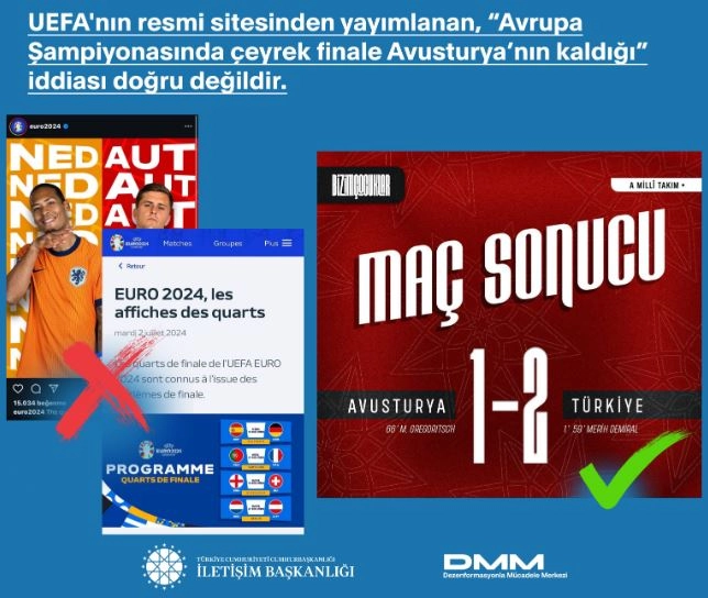 Kaan ULU/ANKARA, (DHA)- İLETİŞİM Başkanlığı Dezenformasyonla Mücadele Merkezi, Avrupa Futbol Federasyonları Birliği'nin (UEFA), web sitesinde yer aldığı belirtilen Avrupa Futbol Şampiyonası'nda çeyrek finale Avusturya'nın kaldığına ilişkin iddianın doğru olmadığını açıkladı. DMM'nin sosyal medya hesabından yapılan açıklamada, "UEFA'nın resmi sitesinden yayımlanan, 'Avrupa Şampiyonasında çeyrek finale Avusturya'nın kaldığı' iddiası doğru değildir. 2 Temmuz 2024 Salı günü oynanan 2024 Avrupa Şampiyonası son 16 turu eşleşmesinde Türkiye, Avusturya'yı 2-1 mağlup ederek çeyrek finale katılmaya hak kazanmıştır. Türkiye ve Hollanda'nın karşılaşacağı çeyrek final maçı 6 Temmuz 2024 tarihinde saat 22.00'de oynanacaktır" denildi. UEFA'nın sitesinde 2 Temmuz'da Avusturya'nın çeyrek finale kaldığı paylaşımı yapıldığı, ardından bunun silindiği belirtildi. (DHA)