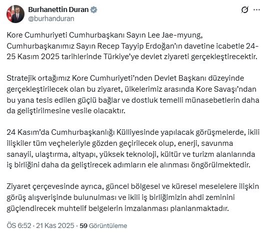 İletişim Başkanı Duran, sosyal medya hesabından yaptığı açıklamada, "Kore Cumhuriyeti Cumhurbaşkanı Sayın Lee Jae-myung, Cumhurbaşkanımız Sayın Recep Tayyip Erdoğan'ın davetine icabetle 24-25 Kasım 2025 tarihlerinde Türkiye'ye devlet ziyareti gerçekleştirecektir. Stratejik ortağımız Kore Cumhuriyeti'nden devlet başkanı düzeyinde gerçekleştirilecek olan bu ziyaret, ülkelerimiz arasında Kore Savaşı'ndan bu yana tesis edilen güçlü bağlar ve dostluk temelli münasebetlerin daha da geliştirilmesine vesile olacaktır. 24 Kasım'da Cumhurbaşkanlığı Külliyesi'nde yapılacak görüşmelerde, ikili ilişkiler tüm veçheleriyle gözden geçirilecek olup, enerji, savunma sanayii, ulaştırma, altyapı, yüksek teknoloji, kültür ve turizm alanlarında iş birliğini daha da geliştirecek adımların ele alınması öngörülmektedir. Ziyaret çerçevesinde ayrıca, güncel bölgesel ve küresel meselelere ilişkin görüş alışverişinde bulunulması ve ikili iş birliğimizin ahdi zeminini güçlendirecek muhtelif belgelerin imzalanması planlanmaktadır" ifadelerini kullandı. (DHA)