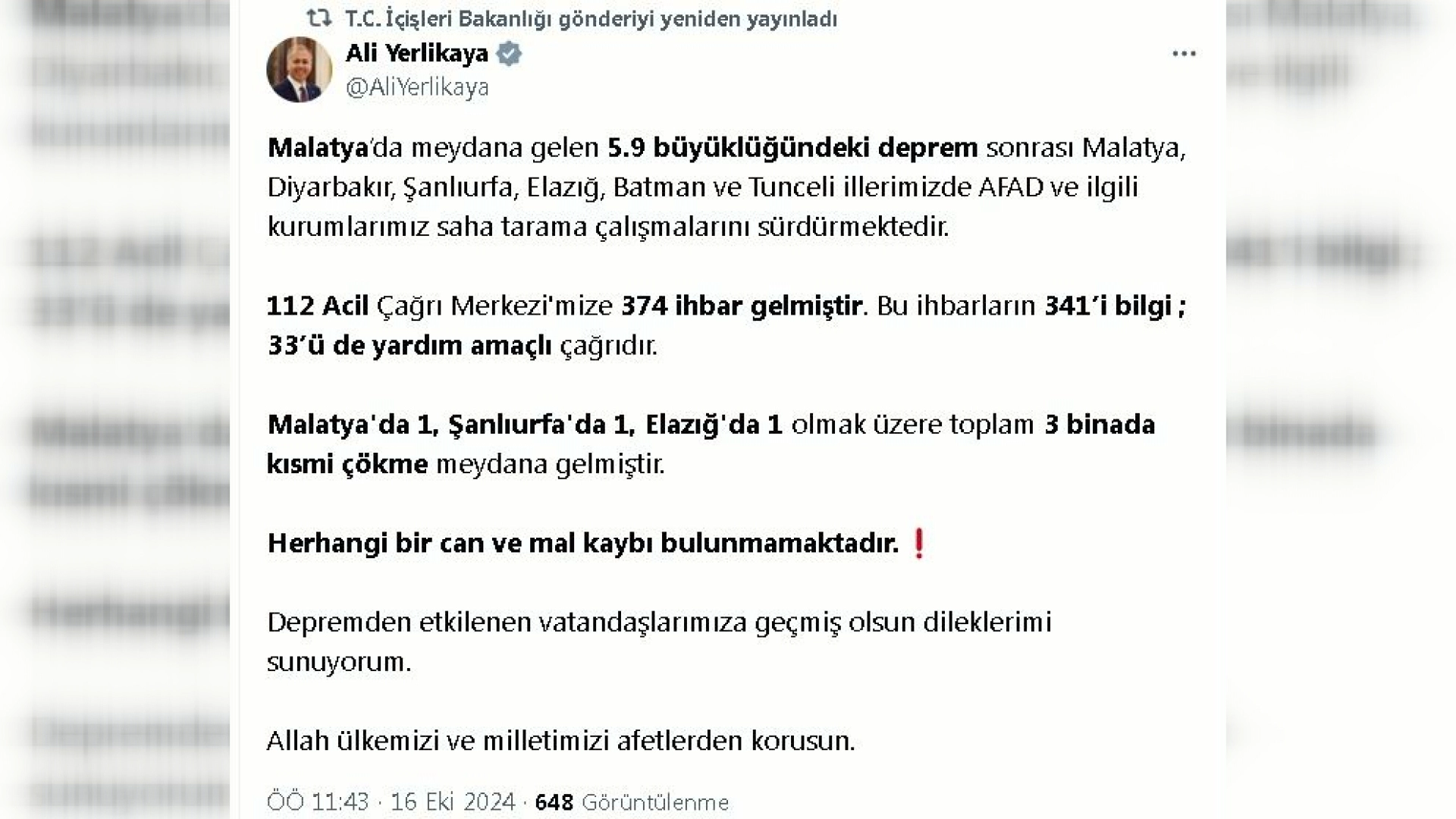 AFAD: ELAZIĞ'DA 4 KİŞİ SAĞ KURTARILDIAFAD'dan yapılan yazılı açıklamada, Malatya, Diyarbakır, Şanlıurfa, Elazığ, Batman ve Tunceli AFAD ekipleri ile emniyet ve jandarma ekiplerinin saha tarama çalışmaları devam ettiği belirtilerek, "Deprem nedeniyle 112 Acil Çağrı Merkezi'ne toplam 374 ihbar gelmiştir. Malatya, Şanlıurfa ve Elazığ illerimizde toplam 4 binada hasar meydana gelmiştir. Elazığ ilinde kısmi hasar gören 1 binadaki 4 kişi sağ olarak kurtarılmıştır. Malatya ili Pütürge ve Kale ilçelerinde kaya düşmesi meydana gelmiştir. Gelişmeleri takip ediyoruz" denildi.BAKAN YERLİKAYA: 3 BİNADA KISMİ ÇÖKME VARİçişleri Bakanı Ali Yerlikaya, Malatya'nın Kale ilçesi merkezli 5.9'luk depreme ilişkin sosyal medya hesabından yaptığı açıklamada, "Malatya'da meydana gelen 5.9 büyüklüğündeki deprem sonrası Malatya, Diyarbakır, Şanlıurfa, Elazığ, Batman ve Tunceli illerimizde AFAD ve ilgili kurumlarımız saha tarama çalışmalarını sürdürmektedir. 112 Acil Çağrı Merkezimize 374 ihbar gelmiştir. Bu ihbarların 341'i bilgi; 33'ü de yardım amaçlı çağrıdır. Malatya'da 1, Şanlıurfa'da 1, Elazığ'da 1 olmak üzere toplam 3 binada kısmi çökme meydana gelmiştir. Herhangi bir can ve mal kaybı bulunmamaktadır. Depremden etkilenen vatandaşlarımıza geçmiş olsun dileklerimi sunuyorum" ifadelerini kullandı.BAKAN KURUM: GELİŞMELERİ TAKİP EDİYORUZÇevre, Şehircilik ve İklim Değişikliği Bakanı Murat Kurum, sosyal medya hesabından yaptığı açıklamada, Malatya'nın Kale ilçesinde meydana gelen ve çevre illerde de hissedilen 5,9 büyüklüğündeki deprem nedeniyle vatandaşlara geçmiş olsun dileklerini ileterek, "Gelen ihbarlar değerlendirilmekte, ekiplerimiz depremden etkilenen tüm illerimizde sahada teyakkuz halinde çalışmalarına devam etmektedir. Gelişmeleri takip ediyoruz" dedi. BAKAN URALOĞLU: SAHA ÇALIŞMALARI DEVAM EDİYORUlaştırma ve Altyapı Bakanı Abdulkadir Uraloğlu da sosyal medya hesabından açıklama yaparak, "Malatya'nın Kale ilçesinde meydana gelen depremde ilgili kurumlarımızın saha tarama çalışmaları devam ediyor. Şu ana kadar ulaşım ve haberleşmeye dair herhangi bir sorun tespit edilmemiştir. Depremden etkilenen tüm vatandaşlarımıza geçmiş olsun dileklerimi iletiyorum. Rabbim her türlü afetten memleketimizi korusun" açıklamasında bulundu. ALTUN: GEÇMİŞ OLSUNİletişim Başkanı Fahrettin Altun da "Malatya'nın Kale ilçesinde meydana gelen ve çevre illerde de hissedilen depremden etkilenen tüm vatandaşlarımıza geçmiş olsun dileklerimizi iletiyoruz. Şu ana kadar deprem sebepli herhangi bir olumsuzluk tespit edilmemiş olup, ilgili birimlerimizin her biri kendi alanlarında tarama faaliyetlerini sürdürmektedir. Depremle ilgili özellikle medya kuruluşlarımızın sansasyon ve dezenformasyondan uzak, sorumlu yayıncılık bilinciyle hareket etmelerini beklediğimizi bir kez daha ifade ediyoruz" dedi. (DHA)