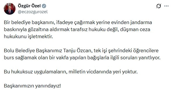 Özgür Özel, sanal medya hesabından yaptığı paylaşımda, "Bir belediye başkanını, ifadeye çağırmak yerine evinden jandarma baskınıyla gözaltına aldırmak tarafsız hukuku değil, düşman ceza hukukunu işletmektir. Bolu Belediye Başkanımız Tanju Özcan, tek işi şehrindeki öğrencilere burs sağlamak olan bir vakfa yapılan bağışlarla ilgili soruları yanıtlıyor. Bu hukuksuz uygulamaların, milletin vicdanında yeri yoktur. Başkanımızın yanındayız" ifadelerini kullandı. (DHA)