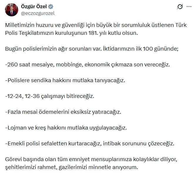 Özel, sanal medya hesabından yaptığı paylaşımda, “Milletimizin huzuru ve güvenliği için büyük bir sorumluluk üstlenen Türk Polis Teşkilatımızın kuruluşunun 181’inci yılı kutlu olsun. Bugün polislerimizin ağır sorunları var. İktidarımızın ilk 100 gününde; 260 saat mesaiye, mobbinge, ekonomik çıkmaza son vereceğiz. Polislere sendika hakkını mutlaka tanıyacağız. 12-24, 12-36 çalışmayı bitireceğiz. Fazla mesai ödemelerini eksiksiz yatıracağız. Lojman ve kreş hakkını mutlaka uygulayacağız. Emekli polisi sefaletten kurtaracağız, intibak sorununu çözeceğiz. Görevi başında olan tüm emniyet mensuplarımıza kolaylıklar diliyor, şehitlerimizi rahmet, gazilerimizi minnetle anıyorum” ifadelerini kullandı. (DHA)