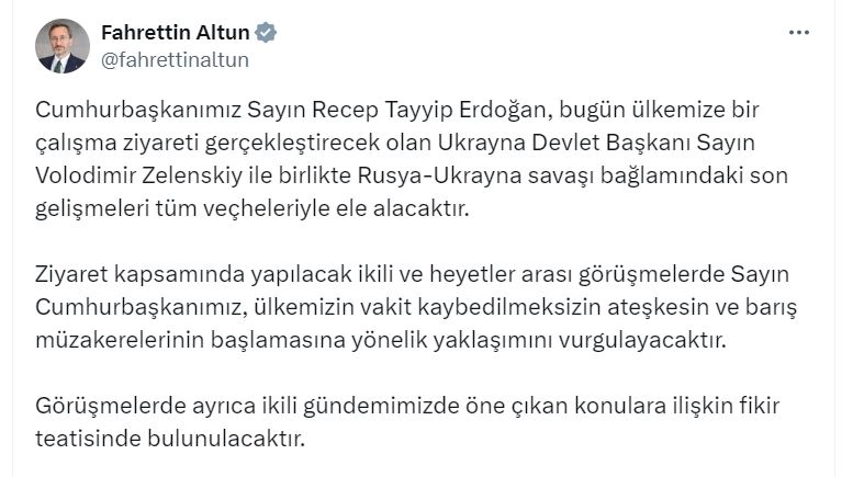 Aybala MELEK-Celal ATALAY, (DHA)- UKRAYNA Devlet Başkanı Volodimir Zelenskiy, Rusya-Ukrayna savaşı bağlamındaki son gelişmeleri Cumhurbaşkanı Recep Tayyip Erdoğan ile görüşmek üzere Ankara'ya geldi.Cumhurbaşkanı Erdoğan'ın barış müzakereleri vesilesiyle Rusya ve Ukrayna heyetlerini Türkiye'de ağırlamaktan memnuniyet duyacağını belirtmesi üzerine Ukrayna Devlet Başkanı Volodimir Zelenskiy, Türkiye'ye geldi. Saat 12.00'de Ankara Esenboğa Havalimanı'na gelen Zelenskiy, yetkililer tarafından karşılandı. Cumhurbaşkanlığı Külliyesi'ne geçen Zelenskiy, resmi törenle karşılandıktan sonra Cumhurbaşkanı Erdoğan ile görüşecek.İletişim Başkanı Fahrettin Altun, ziyarete ilişkin sosyal medya hesabından açıklama yaptı. Altun, "Cumhurbaşkanımız Sayın Recep Tayyip Erdoğan, bugün ülkemize bir çalışma ziyareti gerçekleştirecek olan Ukrayna Devlet Başkanı Sayın Volodimir Zelenskiy ile birlikte Rusya-Ukrayna savaşı bağlamındaki son gelişmeleri tüm veçheleriyle ele alacaktır. Ziyaret kapsamında yapılacak ikili ve heyetler arası görüşmelerde Sayın Cumhurbaşkanımız, ülkemizin vakit kaybedilmeksizin ateşkesin ve barış müzakerelerinin başlamasına yönelik yaklaşımını vurgulayacaktır. Görüşmelerde ayrıca ikili gündemimizde öne çıkan konulara ilişkin fikir teatisinde bulunulacaktır" dedi. (DHA)