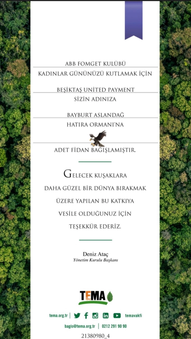 Mikail KARAMAN / ANKARA,(DHA)- ABB FOMGET Kadın Futbol Takımı, 8 Mart Dünya Kadınlar Günü kapsamında kadınların emeğini ve dayanışmasını yeşertmek amacıyla Türkiye Futbol Federasyonu ve Kadın Futbol Süper Ligi’nde yer alan tüm kulüpler adına TEMA Vakfı’na fidan bağışında bulundu.ABB FOMGET Kadın Futbol Takımı, 8 Mart Dünya Kadınlar Günü dolayısıyla anlamlı bir sosyal sorumluluk projesine imza attı. ABB FOMGET Kadın Futbol Takımı, Türkiye Futbol Federasyonu ve Kadın Futbol Süper Ligi’nde yer alan tüm kulüpler adına TEMA Vakfı’na fidan bağışında bulundu. Bu organizasyona Beşiktaş ve Trabzonspor da destek vererek fidan bağışında bulundu. Yapılan etkinlikle toplumsal farkındalık oluşturulurken, çevresel sürdürülebilirlik ve doğaya olan duyarlılığın arttırılması hedeflendi. ABB FOMGET Kadın Futbol Takımı, projeye destek veren Türkiye Futbol Federasyonu, Kadın Futbol Süper Ligi temsilcileri ve katkıda bulunan kulüplere teşekkür etti.
