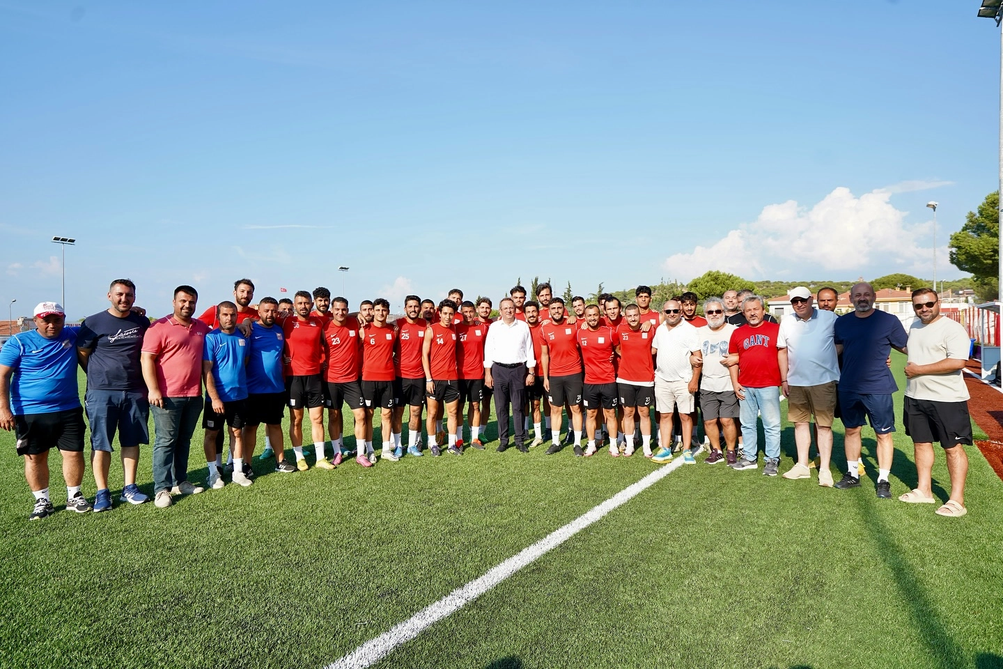 AYVALIK,(DHA)- TFF 3'üncü Lig 3'üncü Grup'taki sezonun ilk maçında cumartesi günü Aliağa FK'yı konuk edecek Ayvalıkgücü Belediyespor'a Ayvalık Belediye Başkanı Mesut Ergin'den moral geldi. Kırmızı-beyazlı takımın antrenmanını izleyen Mesut Ergin, futbolcular ve teknik heyete başarı diledi. Ayvalıkgücü yönetimi, "Sezon öncesi hazırlık çalışmaları sürecinde bizleri yalnız bırakmayan Belediye Başkanımız Sayın Mesut Ergin'e desteğinden dolayı teşekkür ederiz" açıklamasını yaptı.