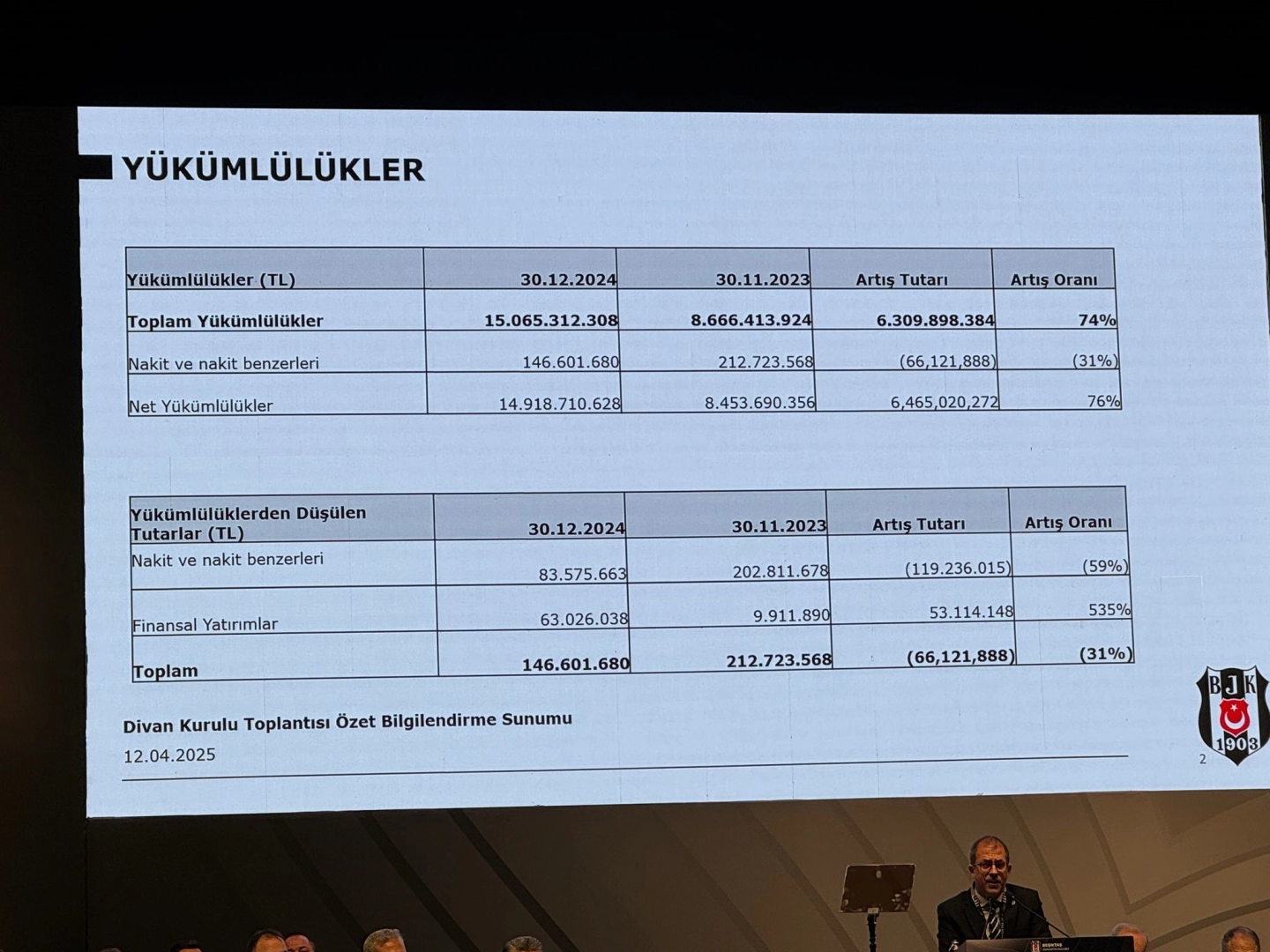 Siyah-beyazlı kulübün borcu 15 milyar 65 milyon 312 bin 308 TLAli DANAŞ / İSTANBUL,(DHA)- BEŞİKTAŞ’ın bugün gerçekleştirilen 2025 yılı 1’inci olağan divan kurulu toplantısında borcun 15 milyar 65 milyon 312 bin 308 TL olduğu açıklandı.Beşiktaş Kulübü'nün 2025 Yılı 1’inci Olağan Divan Kurulu Toplantısı, İstanbul Lütfi Kırdar Kongre ve Sergi Sarayı’nda gerçekleştiriliyor. Beşiktaş Denetim Kurulu Üyesi Özgür Şentürk; mali konularda bilgiler verirken, siyah-beyazlı kulübün borcunu da açıkladı.Şentürk, 31 Aralık 2024 tarihi itibarıyla siyah-beyazlı kulübün borcunun 15 milyar 65 milyon 312 bin 308 TL olduğunu açıkladı.