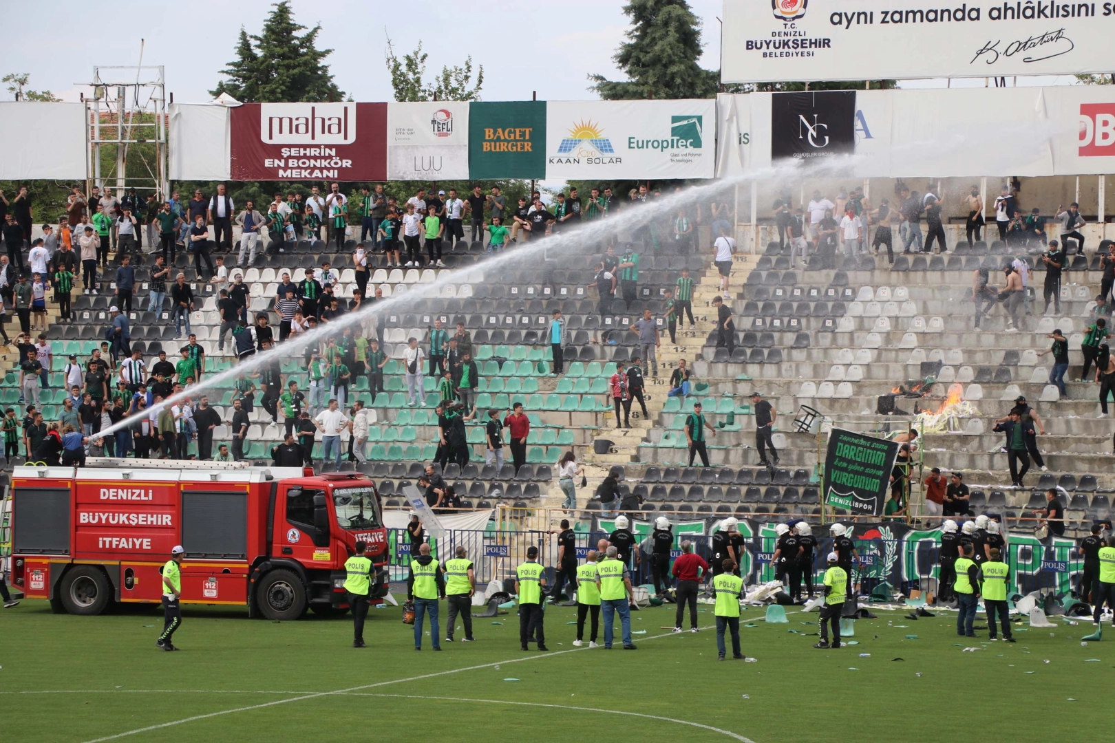 DENİZLİ, (DHA)- TÜRK futbolunun en köklü kulüplerinden Denizlispor, Süper Lig'den 4 yıl içinde amatör kümeye gerilerken kentin en büyük temsilcisinin küme düştüğü haftada Denizli İdmanyurdu ise 3'üncü Lig'e yükseldi. Denizlispor hafta sonu cumartesi günü 3'üncü Lig 4'üncü Grup'ta kazansa kurtuluşunu ilan edeceği maçta Niğde Belediyespor'la 1-1 berabere kalarak intihar etti. Maçın ardından yaşanan saha olaylarında Denizli Atatürk Stadı yangın yerine döndü. Denizli'nin diğer temsilcisi Denizli İdmanyurdu ise 1 gün sonra Bölgesel Amatör Lig 7’nci Grup'ta şampiyonluğu garantileyip kenti profesyonel ligde temsilcisiz kalmaktan kurtardı.Denizli İdmanyurdu, bay takım olarak geçtiği haftada en yakın rakibi Torbalıspor deplasmanda Yeşil Çivril Belediyespor'a 1-0 yenilince maça bile çıkmadan şampiyonluğu garantiledi. Son hafta öncesi Torbalıspor'un 4 puan önünde olan Denizli ekibi şampiyonluk kupasına 4 Mayıs Pazar günü Asarlıkspor maçında kavuşarak yeni sezonda 3'üncü Lig'de mücadele edecek. Denizli İdmanyurdu maçlarına Başkarcı ilçesinde çıkıyor. Grupta Torbalıspor ise 3'üncü Lig'e yükselmek için Play-Off oynayacak. DENİZLİSPOR'DA KAVGA BİTMİYORTrajik bir şekilde tarihinde ilk kez amatör lige gerileyen Denizlispor'da sezon içinde yaşanan tartışmalar takım küme düştükten sonra da devam ediyor. Transfer yasağı yüzünden 4 yıldır takviye yapamayan, sürekli yönetim krizleri ve mali sorunlar yaşayan Denizlispor'da sezon içinde 2.5 ay başkanlık yapan Erhan Ergil, takım küme düştükten sonra daha önce de sorun yaşadığı kaptan Gökhan Süzen'e yüklendi. Niğde maçını maraton tribününden taraftar gibi izleyen Ergil, sosyal medyada tecrübeli futbolcuyu takımı düşürmekle suçlayıp tüm alacaklarını kulübe bağışlamasını istedi.