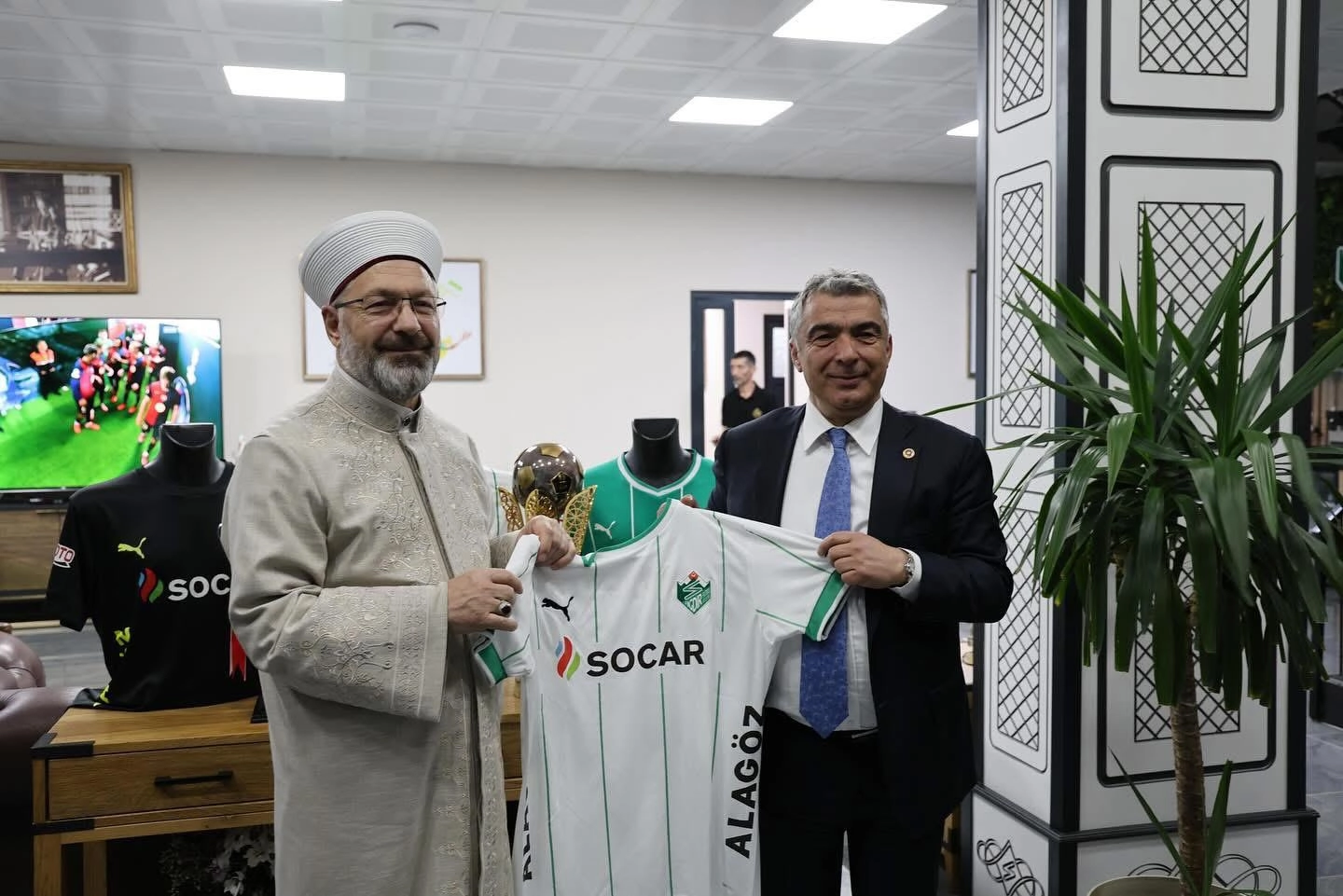 Özkan AYDIN / IĞDIR, (DHA)- DİYANET İşleri Başkanı Ali Erbaş geçen yıl TFF 1'inci Lig'e yükselen Alagöz Holding Iğdır Futbol Kulübünü ziyaret etti. Kulüp Başkanı Cantürk Alagöz, Erbaş'a forma hediye etti. Iğdır'da dün düzenlenen iftar yemeğine katılan Diyanet İşleri Başkanı Ali Erbaş, geçen yıl TFF 1'inci Lig'e yükselen 72 yıl aradan sonra şehrin 1'nci Lig hasretini bitiren Alagöz Holding Iğdır Futbol Kulübünü ziyaret etti. Tesisleri gezdiren kulüp başkanı ve AK Parti Iğdır Milletvekili Cantürk Alagöz, kulüp hakkında bilgi verdi. Başkan Cantürk Alagöz, Erbaş'a forma hediye etti. Futbol tesislerini çok beğendiğini söyleyen Diyanet İşleri Başkanı Ali Erbaş, Cantürk Alagöz’ü tebrik etti. Erbaş, "Gençleri kötü alışkanlıklardan uzaklaştırarak spora yönlendirmeniz taktire şayandır" dedi. (DHA)
