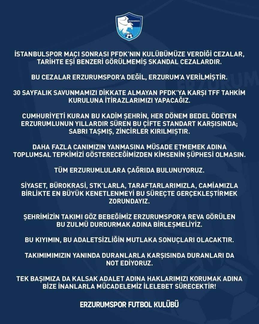 -Erzurumspor, yazılı bir açıklama yaparken İstanbulspor’un olayları başlatan taraf olduğunu koridorlardaki görüntüleri paylaşarak ileri sürdü -Tahkim’e gidilecekİSTANBUL, (DHA)- 19 Nisan da oynanan ve İstanbulspor'un deplasmanda 2-1 kazandığı maçın ardından soyunma odasına giden koridorda olaylar çıktı. Erzurumspor Profesyonel Futbol Disiplin Kurulu'na (PFDK) sevk edilip ceza yağmuruna maruz kalırken İstanbulspor'un disiplin kuruluna dahi sevk edilmemesi Erzurumspor'u çileden çıkardı. Erzurumspor cephesi bu cezaları hak etmediklerini belirtip savunma hazırladı. 30 sayfalık raporun dikkate alınmadığını belirten Erzurumsporlu yöneticiler Türkiye Futbol Federasyonu (TFF) Tahkim Kurulu'na başvuracaklarını söyleyerek şu açıklamayı yaptı; " İstanbulspor maçı sonrası PFDK'nın kulübümüze verdiği cezalar, tarihte eşi benzeri görülmemiş skandal cezalardır. Bu cezalar Erzurumspor'a değil, Erzurum'a verilmiştir. 30 sayfalık savunmamızı dikkate almayan PFDK'ya karşı TFF Tahkim Kurulu'na itirazlarımızı yapacağız. Cumhuriyeti kuran bu kadim şehrin, her dönem bedel ödeyen Erzurumlunun yıllardır süren bu çift standart karşısında; sabrı taşmış, zincirler kırılmıştır. Daha fazla canımızın yanmasına müsaade etmemek adına toplumsal tepkimizi göstereceğimizden kimsenin şüphesi olmasın. Tüm Erzurumlulara çağrıda bulunuyoruz. Siyaset, Bürokrasi, STK'larla, taraftarımızla, camiamızla birlikte en büyük kenetlenmeyi bu süreçte gerçekleştirmek zorundayız. Şehrimizin takımı göz bebeğimiz Erzurumspor'a reva görülen bu zulmü durdurmak adına birleşmeliyiz. Bu kıyımın, bu adaletsizliğin mutlaka sonuçları olacaktır. Takımımızın yanında duranlarla karşısında duranları da not ediyoruz. Tek başımıza da kalsak adalet haklarımızı korumak adına bize inanlarla mücadelemiz ilelebet sürecektir."Erzurumspor'a PFDK tarafından verilen cezalar şu şekilde;"1- ERZURUMSPOR FK’nın, 19.04.2025 tarihinde oynanan ERZURUMSPOR FK-UĞUR OKULLARI İSTANBULSPOR Trendyol 1. Lig müsabakasında, takım halinde sportmenliğe aykırı hareketi nedeniyle FDT’nin 40/2. maddesi uyarınca 23.625.-TL PARA CEZASI ile cezalandırılmasına,Aynı müsabakada ERZURUMSPOR FK’nın, taraftarlarının ve mensuplarının neden olduğu saha olayları nedeniyle FDT’nin 52/2. maddesi uyarınca 2 RESMİ MÜSABAKAYI KENDİ SAHASINDA SEYİRCİSİZ OYNAMA CEZASI ile cezalandırılmasına,Aynı müsabakada ERZURUMSPOR FK’nın, Sportif Ekipman Talimatı’na aykırı eylemi nedeniyle FDT’nin 46/1. maddesi uyarınca İHTAR CEZASI ile cezalandırılmasına,Aynı müsabakada ERZURUMSPOR FK’nın, taraftarlarının neden olduğu çirkin ve kötü tezahürat nedeniyle ve bu eylemin aynı sezon içinde ev sahibi kulüp olduğu müsabakada 4. kez gerçekleştirilmesinden dolayı FDT’nin 53/2. maddesi uyarınca 150.000.-TL PARA CEZASI ile cezalandırılmasına,Aynı müsabakada ERZURUMSPOR FK’nın, stadyuma usulsüz seyirci alınmasından dolayı FDT’nin 49/1. maddesi uyarınca ve FDT’nin 13. maddesinin uygulanması suretiyle 46.800.-TL PARA CEZASI ile cezalandırılmasına,Aynı müsabakada ERZURUMSPOR FK’nın, akreditasyon sisteminin işletilmemesinden dolayı talimatlara aykırılık nedeniyle FDT’nin 46/1. maddesi uyarınca İHTAR CEZASI ile cezalandırılmasına,Aynı müsabakada ERZURUMSPOR FK idarecisi İBRAHİM KINIK’ın, sportmenliğe aykırı hareketi nedeniyle FDT’nin 36/1-b maddesi uyarınca 30 GÜN HAK MAHRUMİYETİ ve 111.500.-TL PARA CEZASI ile cezalandırılmasına,Aynı müsabakada ERZURUMSPOR FK idarecisi İBRAHİM KINIK’ın, akredite edilmediği alanlarda bulunmasından dolayı talimatlara aykırılık nedeniyle FDT’nin 46/1. maddesi uyarınca 29.250.-TL PARA CEZASI ile cezalandırılmasına,Aynı müsabakada ERZURUMSPOR FK idarecisi CABBAR ERDOĞAN’ın, akredite edilmediği alanlarda bulunmasından dolayı talimatlara aykırılık nedeniyle FDT’nin 46/1. maddesi uyarınca 29.250.-TL PARA CEZASI ile cezalandırılmasına,Aynı müsabakada ERZURUMSPOR FK görevlisi ÖMER FARUK ÖĞDÜM’ün, hakem soyunma odası koridorlarında müsabaka hakemine yönelik sportmenliğe aykırı hareketi nedeniyle FDT’nin 39/2. ile FDT’nin 95/4. maddeleri uyarınca ve FDT’nin 13. maddesinin uygulanması suretiyle 6 RESMİ MÜSABAKADA SOYUNMA ODASINA VE YEDEK KULÜBESİNE GİRİŞ YASAĞI CEZASI ile cezalandırılmasına,Aynı müsabakada ERZURUMSPOR FK antrenörü YUSUF RANDA’nın, ihraç sonrası müsabaka hakemine yönelik hakareti nedeniyle FDT’nin 41/1-c ve 35/4. maddeleri uyarınca ve çift sarı kart görmesi nedeniyle yer almaması gereken müsabaka dışında ayrıca 3 RESMİ MÜSABAKADA SOYUNMA ODASINA VE YEDEK KULÜBESİNE GİRİŞ YASAĞI ve 29.250.-TL PARA CEZASI ile cezalandırılmasına,Aynı müsabakada ERZURUMSPOR FK antrenörü YUSUF RANDA’nın, müsabaka sonrası rakip takım mensubuna yönelik hakareti nedeniyle FDT’nin 41/1-c ve 35/4. maddeleri uyarınca 2 RESMİ MÜSABAKADA SOYUNMA ODASINA VE YEDEK KULÜBESİNE GİRİŞ YASAĞI ve 29.250.-TL PARA CEZASI ile cezalandırılmasına,Aynı müsabakada ERZURUMSPOR FK antrenörü YUSUF RANDA’nın, tedbire uymama eylemi nedeniyle FDT’nin 82/1-b ve 50/1-c maddeleri uyarınca ve FDT’nin 13. maddesinin uygulanması suretiyle 2 RESMİ MÜSABAKADA SOYUNMA ODASINA ve YEDEK KULÜBESİNE GİRİŞ YASAĞI ve 45.000.-TL PARA CEZASI ile cezalandırılmasına,Aynı müsabakada ERZURUMSPOR FK antrenörü SERKAN ZAİMOĞLU’nun, müsabaka sonrası akredite edilmediği yeşil zemine girmesinden dolayı talimatlara aykırılık nedeniyle FDT’nin 46/1. maddesi uyarınca İHTAR CEZASI ile cezalandırılmasına,Aynı müsabakada ERZURUMSPOR FK antrenörü EREN GÜRSOY’un, müsabaka sonrası akredite edilmediği yeşil zemine girmesinden dolayı talimatlara aykırılık nedeniyle FDT’nin 46/1. maddesi uyarın