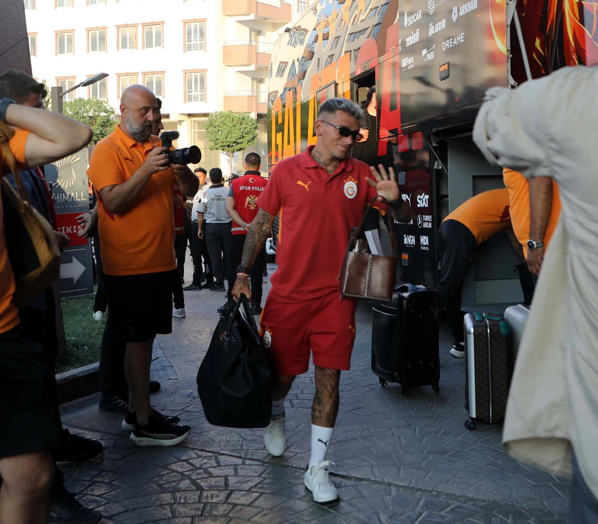 Kadir GÜNEŞ/GAZİANTEP, (DHA)- GALATASARAY kafilesi yarın oynanacak olan Gaziantep FK karşılaşması için Gaziantep'e geldi.Süper Lig’in ilk haftasında yarın oynanacak olan Gaziantep FK maçı için Gaziantep'e gelen Galatasaray kafilesini konaklayacakları otel önünde çok sayıda sarı-kırmızılı taraftar karşıladı. Sevgi gösterilerinde bulanan taraftarlar, pankartlar açarak takıma destek oldu. Saat 18:00’de Gaziantep Havaalanına gelen Galatasaray kafilesi otobüsle konaklayacakları otele geldi. Futbolcular ve teknik heyet taraftarların destekleri arasında otele geçti. Galatasaray’da Osimhen, Icardi ve Morata’nın kafilede yer almadığı görüldü.(FOTOĞRAFLI)