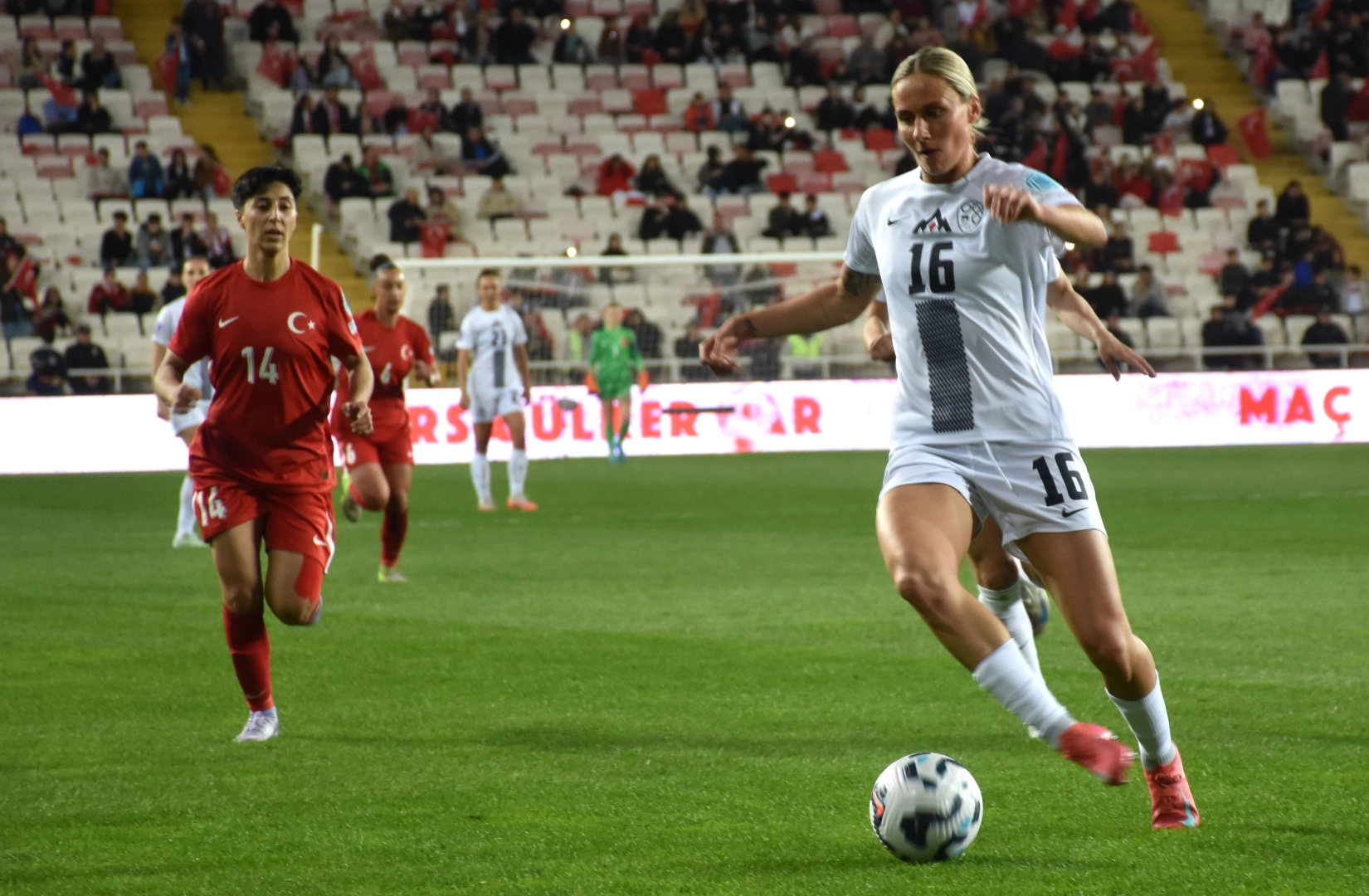 Eraydın AYTEKİN/SİVAS, (DHA) - UEFA Uluslar B Ligi 2'nci Grup'ta mücadele veren Kadın A Milli Futbol Takımı Sivas'ta oynadığı karşılaşmada Slovenya'ya 1-0 mağlup oldu. UEFA Uluslar B Ligi 2'nci Grup'ta mücadele eden Kadın A Milli Takımı 4'üncü maçında Sivas'ta Slovenya ile karşı karşıya geldi. Sivas 4 Eylül Stadı'nda oynanan karşılaşmayı Almanya Futbol Federasyonu'ndan Fabienne Michel yönetti. Michel'in yardımcılıklarını ise Anne Uersfeld ve Silke Fritzius yaptı.Kadın A Milli Futbol Takımımız maça Selda, Ümran, Sejde, Meryem, Melike, Ebru, Elif, Ece, İlayda, Busem ve Gülbin ilk 11'i ile başladı.Konuk Slovenya ise, Mersnik, Golob, Agrez, Korosec, Conc, Prasnikar, Kolbl, Makovec, Erzen, Kramzar ve Sternad 11'i ile mücadele etti.Karşılaşma öncesinde milli formayı 100'üncü kez giyen oyunculara Türkiye Futbol Federasyonu tarafından plaket takdim edildi. Karşılaşmayı çoğunluğu kadın ve çocuklardan oluşan yaklaşık 20 bin taraftar takip ederek, milli takıma destek verdi. Karşılaşmanın ilk yarısı golsüz tamamlandı. 62'nci dakikada Slovenya Kramzar ile öne geçti. Sağ kanattan Korosec'in kullandığı köşe vuruşunda savunma uzaklaştırmak istedi, bir kez daha topla buluşan Korozec'in ortasında arka direkte kafa vuruşunu yapan Kramzar, topu ağlarla buluşturdu ve konuk ekibi 1-0 öne geçirdi. Her iki yarıda konuk Slovenya'nın birer topu da direkten döndü. Karşılaşma Slovenya'nın 1-0 üstünlüğü ile sona erdi. Bu sonuçla Kadın A Milli Futbol Takımı grubunda 4'üncü maçı sonunda 3 puanda kalırken, 12 puana yükselen Slovenya liderliğini sürdürdü. Kadın A Milli Takım, gruptaki beşinci maçında 30 Mayıs 2025 Cuma günü İstanbul'da İrlanda Cumhuriyeti'ni ağırlayacak. (DHA)