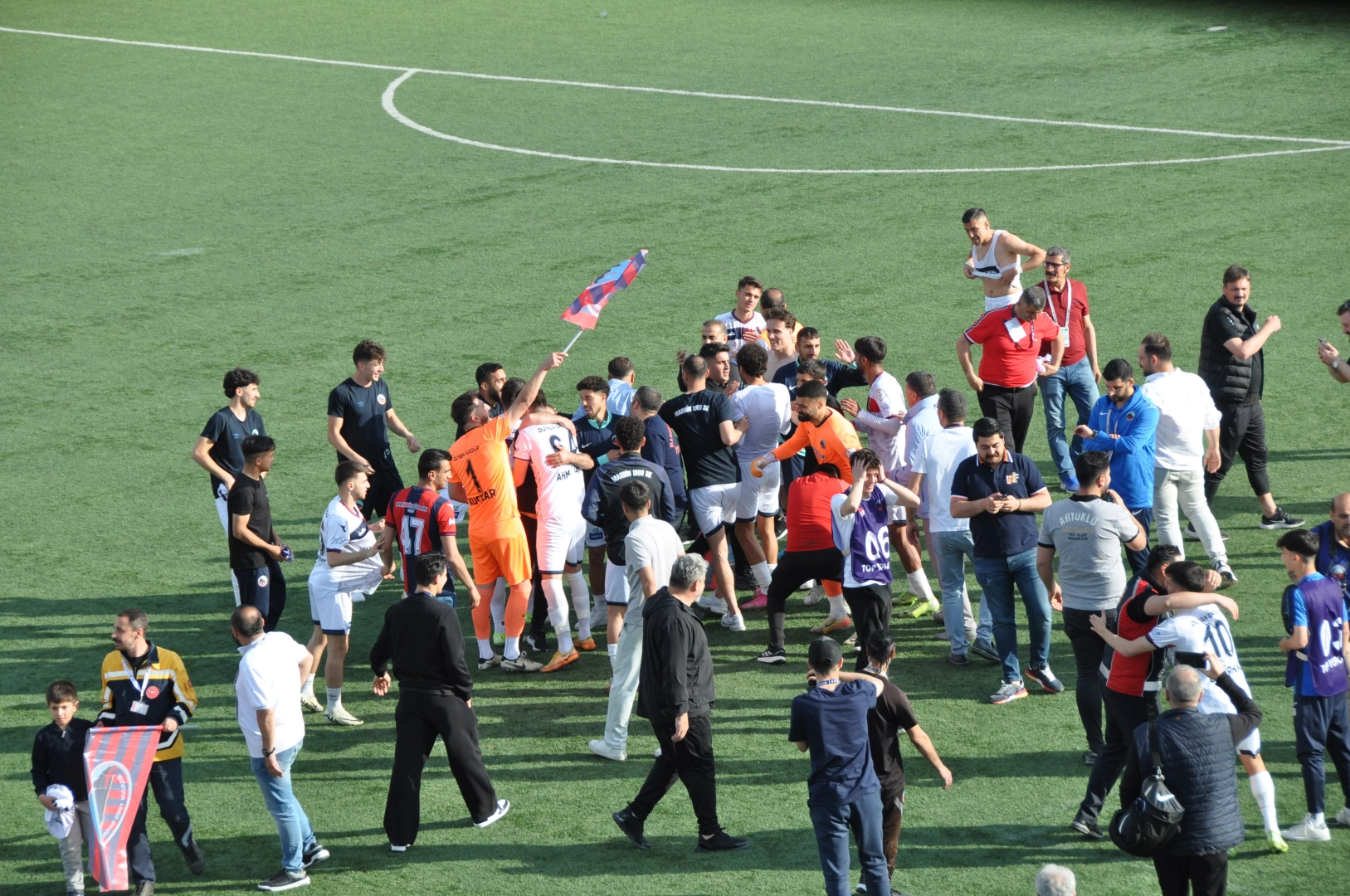 Salih KESKİN/MARDİN,(DHA)- TFF 3'üncü Lig 30'uncu hafta müsabakasında sahasında konuk ettiği Orduspor 1967’yi 4-2 yenerek şampiyon olan Mardin 1969 Spor, 2'nci Lig'e yükseldi. Maç sonrası kentte kutlamalar yapıldı. Mardin 21 Kasım Şehir Stadyumu'nda oynanan müsabakayı Tolga Akbaba yönetti. Akbaba’nın yardımcılıklarını İsmail Çetin ve Denizcan Şahin yaptı. Mardin 1969 Spor, maça, İsmail Cengiz, İslam Çerioğlu, Abdulsamet Kırım, Murat Şevik, Ümit Kurt, Serdar Yiğit, Berkan Ünal, Aykut Sarıdoğan, Barış Sağır, Ahmet Teker ve Umut Dilek ilk 11 ile çıktı. Maça baskılı başlayan Mardin 1969 Spor, 38. dakikada Ahmet Teker’in yerde kaldığı pozisyonda penaltı kazandı. Penaltıda topun başına geçen Barış Sağır, topu filelere göndererek, durumu 1-0 yaptı. 45 1'inci dakikada Orduspor 1967, Sarper Çağlar’ın sol çaprazdan düzgün vuruşuyla eşitliği sağladı. Uzatma dakikalarında başka gol olmayınca taraflar soyunma odasına eşitlikle girdi. İkinci yarıya etkili başlayan konuk Orduspor 1967, 49'uncu dakikada Osman Şahin’in golüyle 2-1 önce geçti. Mardin 1969 Spor, bu gole 58'inci dakikada kornerden Umut Dilek’in kafa vuruşuyla eşitliği sağladı. Bu golden 11 dakika sonra Umut Dilek yine kafa golüyle takımını 3-2 öne geçirdi. 87'nci dakikada Ali Kemal Özkan, frikikten attığı gol ile farkı 2’ye çıkardı. Maçın kalan bölümünde başka gol olmayınca Mardin 1969 Spor şampiyonluğunu ilan ederek 2'nci lige yükseldi. KENTTE ŞAMPİYONLUK KUTLAMALARI BAŞLADICezası nedeniyle seyircisiz oynanan maç sonrası kentin farklı noktalarında şampiyonluk kutlamaları yapıldı. Maçı tribünden takip eden il protokolü de maç sonrası saha içinde Mardin Spor’un sevincine ortak oldu. Mardin Valisi Tuncay Akkoyun ile AK Parti Mardin Milletvekili Faruk Kılıç, futbolcularla halay çekti. VALİ TUNCAY AKKOYUN: HEDEF SÜPER LİGÇok sevinçli olduklarını belirten Vali Tuncay Akkoyun, hedeflerinin Süper Lig olduğunu söyledi. AK Parti Mardin Milletvekili Faruk Kılıç ise 12’nci adam olan Mardin Spor taraftarları adına burada olduklarını, şampiyonluğu 12’nci adama armağan ettiklerini söyledi. ULAŞ ULAŞAN: ANLIMIZIN AKIYLA ŞAMPİYON OLDUKTeknik Direktör Ulaş Ulusan ise, maç sonrası yaptığı açıklamada, şampiyonluğu Mardin halkına armağan ettiğini belirterek, “Çok yorucu bir sezon oldu. Zaman zaman güldük, bazen üzüldük, bazen iftira attılar, bazen hakaret ettiler ama ben oyunculara hep şunu söyledim; biz dimdik ayakta duracağız. Dimdik durduk ve alnımızın akıyla şampiyon olduk. Bunun için çok mutluyuz” dedi.Mardin 1969 Spor Asbaşkanı Veysi Duyan da şampiyonluğu Mardin’in kadim halkına armağan ettiklerini söyledi. Mardin Spor’un ana sponsoru iş insanı Kenan Duyan'da şampiyonlukta emeği geçen herkese teşekkür ederek, destek vermeye devam edeceklerini ifade etti. (DHA)