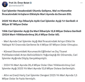 ANKARA, (DHA)- TİCARET Bakanı Ömer Bolat, "Cari işlemler açığının 2025 yılı genelinde yukarı yönlü seyredeceği beklenmekle birlikte, GSYH (gayrisafi yurt içi hasıla) içindeki payı tarihsel ortalamanın altında kalmaya devam edecektir" dedi.Ticaret Bakanı Ömer Bolat, ödemeler dengesi istatistiklerine ilişkin sosyal medya hesabından açıklama yaptı. Bakan Bolat, cari işlemler hesabındaki olumlu gelişmenin, mal ve hizmetler ihracatındaki artışların etkisiyle mart ayında devam ettiğini kaydetti. Aylık cari işlemler açığının yüzde 1 gerileme ile 4 milyar 87 milyon dolar olduğunu aktaran Bolat, yıllık cari işlemler açığının da 12,6 milyar dolara gerilediğini vurguladı.Küresel ekonomideki korumacılık eğilimleri ve dış ticaret politikalarında artan belirsizliklerin yoğunlaştığı bir dönemde, cari işlemler açığında düşüş gerçekleştiğini kaydeden Bolat, "2024 yılı Mart ayında 26,4 milyar dolar olan yıllıklandırılmış cari işlemler açığı, 2025 yılı Mart ayında 12,6 milyar dolara gerilemiştir. Altın ve enerji hariç cari işlemler dengesi 2025 yılı Mart ayında 1,5 milyar dolar ile fazla vermiştir. Yıllıklandırılmış bazda hizmet ihracatı mart ayında bir önceki yılın aynı ayına göre yüzde 7,5 oranında artarak 115,9 milyar dolara yükselmiştir. Ticaret Bakanlığınca uygulanan mal ve hizmet ihracatını artırmaya yönelik destekler ile yıllıklandırılmış mal ve hizmet ihracatı toplamı, mart ayında bir önceki yılın aynı ayına göre yüzde 3,7 oranında artarak 379,3 milyar dolara yükselmiştir. Ticarette artan korumacı eğilimler, Avrupa Birliği’ndeki zayıf ekonomik görünüm ve tarife artışlarının getirdiği belirsizliğin hakim olduğu küresel konjonktürün de etkisi ile cari işlemler açığının 2025 yılı genelinde yukarı yönlü seyredeceği beklenmekle birlikte, GSYH içindeki payı tarihsel ortalamanın (2002-2024 ortalaması; yüzde 3,5) altında kalmaya devam edecektir. Hükümet olarak mal ve hizmet ihracatını artırmaya ve yerli üreticiyi korumaya yönelik politikalarımızı kararlılıkla sürdürerek, cari işlemler hesabında istikrarlı bir seyir sağlanacak ve makroekonomik istikrar güçlendirilecektir. Üretim-yatırım-istihdam-ihracat-adil bölüşüm ve katma değerli üretim önceliklerinde oluşturulan kalkınma stratejimiz ile önümüzdeki dönemde Türkiye ekonomisini bölgesinde ve küresel arenada cazibe merkezi olarak öne çıkarmak amacıyla çalışmalarımızı cumhurbaşkanımızın önderliğinde kararlılıkla sürdüreceğiz" ifadelerini kullandı. (DHA)