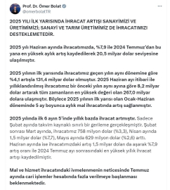 ANKARA,(DHA)- TİCARET Bakanı Ömer Bolat, "AB-27'nin yıllıklandırılmış ithalatının hala yatay seyrini koruması, zayıf dış talep, yakın coğrafyamızda süregelen savaşlar, iç karışıklıklar ve gerilimler, tarife artışlarının getirdiği belirsizliğin devam etmesiyle beraber gelen zorlu rekabet koşullarına rağmen ihracatımızda artış devam etmektedir" dedi.Bakan Bolat, Türkiye İstatistik Kurumu'nun (TÜİK) açıkladığı haziran ayı dış ticaret istatistikleri ile yılın ikinci çeyreğine ilişkin turizm istatistikleriyle ilgili değerlendirmede bulundu. Bolat, sosyal medya hesabından yaptığı açıklamada, "2025 yılı Haziran ayında ihracatımızda, yüzde 7,9 ile 2024 Temmuz'dan bu yana en yüksek aylık artış kaydedilerek, 20,5 milyar dolar seviyesine ulaşılmıştır. 2025 Haziran ayı itibari ile yıllıklandırılmış ihracatımız bir önceki yılın aynı ayına göre 8,2 milyar dolar artarak tüm zamanların en yüksek değeri olan 267 milyar dolara ulaşmıştır. Mal ve hizmet ihracatındaki ivmelenmenin neticesinde temmuz ayında cari işlemler hesabında fazla verilmeye başlanması beklenmektedir" dedi. 'ÜRETİM VE İSTİHDAM ÜZERİNDE OLUMLU SONUÇLAR VERMEKTE'Bakan Bolat, 2025 yılının ikinci çeyreğinde turizm gelirinin, bir önceki yılın aynı çeyreğine göre yüzde 8,4 artarak 16,3 milyar dolar olduğunu belirterek, "Ülkemize gelen ziyaretçi sayısı geçen yılın aynı dönemine göre yüzde 2 oranında artışla 16,4 milyon kişiye ulaşmıştır. Gerek mal gerekse hizmetlere yönelik gelen bu veriler ışığında cari işlemler açığının haziran ayında 1-1,5 milyar dolar aralığında gerçekleşeceğini temmuz ayından itibaren ise mevsimsel katkının güçlenmesi ile fazla verilmeye başlanacağını öngörüyoruz. AB-27'nin yıllıklandırılmış ithalatının hala yatay seyrini koruması, zayıf dış talep, yakın coğrafyamızda süregelen savaşlar, iç karışıklıklar ve gerilimler, tarife artışlarının getirdiği belirsizliğin devam etmesiyle beraber gelen zorlu rekabet koşullarına rağmen ihracatımızda artış devam etmektedir. Ticaret Bakanlığı olarak, ihracatçılarımıza sunduğumuz destekler, ticari diploması faaliyetlerimizin etkisiyle ihracatta elde edilen başarılar, üretim ve istihdam üzerinde olumlu sonuçlar vermektedir. Küresel ekonomi ve ticaretteki zorlu koşullara rağmen Bakanlık olarak ihracatçılarımızın önünü açan desteklerimiz ve etkin ticari diplomasi faaliyetlerimiz ile 2025 yılında da azim ve gayretle çalışacağımızı ifade etmek isterim" açıklamasında bulundu. (DHA)