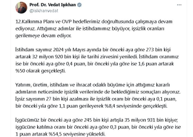 ANKARA, (DHA)- ÇALIŞMA ve Sosyal Güvenlik Bakanı Vedat Işıkhan, mayıs ayında istihdam edilen kişi sayısının bir önceki aya göre 273 bin kişi artarak, 32 milyon 920 bin kişi ile tarihi zirvesini yenilediğini açıkladı.Bakan Işıkhan, Türkiye İstatistik Kurumu'nun duyurduğu mayıs ayı iş gücü istatistiklerine ilişkin, sosyal medya hesabından yaptığı açıklamada, "12'nci Kalkınma Planı ve OVP (Orta Vadeli Program) hedeflerimiz doğrultusunda çalışmaya devam ediyoruz. Attığımız adımlar ile istihdamımız büyüyor, işsizlik oranları gerilemeye devam ediyor. İstihdam sayımız, 2024 yılı Mayıs ayında bir önceki aya göre 273 bin kişi artarak, 32 milyon 920 bin kişi ile tarihi zirvesini yeniledi. İstihdam oranımız, bir önceki aya göre 0,4 puan, bir önceki yıla göre ise 1,6 puan artarak yüzde 50 olarak gerçekleşti. Yatırım, üretim, istihdam ve ihracat odaklı büyüme için attığımız kararlı adımların neticesinde, işsizlik verilerinde de beklediğimiz sonuçları alıyoruz. İşsiz sayısının 27 bin kişi azalması ile işsizlik oranı bir önceki aya 0,1 puan, bir önceki yıla göre 1,1 puan gerileyerek yüzde 8,4 seviyesinde gerçekleşti. İş gücümüz, bir önceki aya göre 245 bin kişi artışla 35 milyon 931 bin kişiye; iş gücüne katılma oranı bir önceki aya göre 0,3 puan, bir önceki yıla göre ise 1 puan artarak yüzde 54,5 seviyesine yükseldi" ifadelerini kullandı. (DHA)