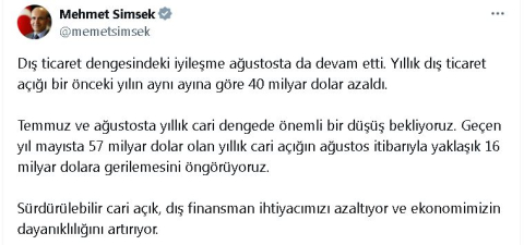 ANKARA, (DHA)- HAZİNE ve Maliye Bakanı Mehmet Şimşek, temmuz ve ağustosta yıllık cari dengede önemli düşüş beklendiğini, geçen yıl mayısta 57 milyar dolar olan yıllık cari açığın ağustos itibarıyla yaklaşık 16 milyar dolara gerilemesinin öngörüldüğünü açıkladı.Bakan Şimşek, sosyal medya hesabından yaptığı açıklamada, "Dış ticaret dengesindeki iyileşme ağustosta da devam etti. Yıllık dış ticaret açığı bir önceki yılın aynı ayına göre 40 milyar dolar azaldı. Temmuz ve ağustosta yıllık cari dengede önemli bir düşüş bekliyoruz. Geçen yıl mayısta 57 milyar dolar olan yıllık cari açığın ağustos itibarıyla yaklaşık 16 milyar dolara gerilemesini öngörüyoruz. Sürdürülebilir cari açık, dış finansman ihtiyacımızı azaltıyor ve ekonomimizin dayanıklılığını artırıyor" ifadelerini kullandı. (DHA)