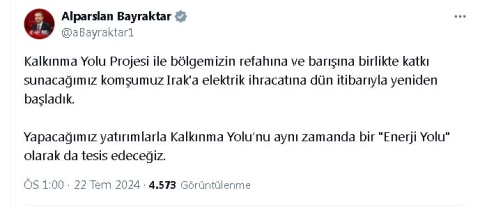 ANKARA, (DHA)-TÜRKİYE, 3 yıllık bir aranın ardından Irak'a elektrik ihracatına yeniden başladı. Enerji ve Tabii Kaynaklar Bakanı Alparslan Bayraktar, "Yapacağımız yatırımlarla Kalkınma Yolu'nu aynı zamanda bir 'Enerji Yolu' olarak tesis edeceğiz" dedi. Cumhurbaşkanı Recep Tayyip Erdoğan'ın 22 Nisan'da gerçekleştirdiği Irak ziyaretinde beraberinde yer alan Enerji ve Tabii Kaynaklar Bakanı Bayraktar hem Bağdat hem Erbil temasları kapsamında muhataplarıyla olası iş birliklerini masaya yatırdı. Ziyaretten 3 ay sonra iki ülke, enerji alanında yeni bir adım attı. Türkiye, 3 yıllık bir aranın ardından Irak'a elektrik ihracatına yeniden başladı. İhracat, Türkiye-Irak arasında mevcut hat üzerinden gerçekleştirilirken; Irak'a azami 300 megawatta kadar elektrik sağlanacak. Bakan Bayraktar, sosyal medya hesabından yaptığı açıklamada, "Kalkınma Yolu Projesi ile bölgemizin refahına ve barışına birlikte katkı sunacağımız komşumuz Irak'a elektrik ihracatına dün itibarıyla yeniden başladık. Yapacağımız yatırımlarla Kalkınma Yolunu aynı zamanda bir 'Enerji Yolu' olarak da tesis edeceğiz" dedi. (DHA)