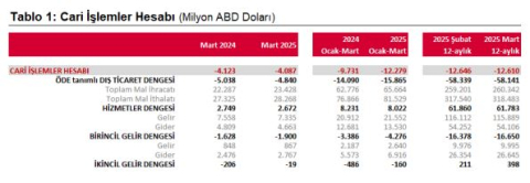 ANKARA, (DHA)- TÜRKİYE Cumhuriyet Merkez Bankası (TCMB), mart ayında cari işlemler dengesinin 4 milyar 87 milyon dolar açık verdiğini, yıllıklandırılmış verilere göre cari açığın 12,6 milyar dolar olduğunu açıkladı. TCMB, Mart 2025 dönemine ilişkin ödemeler dengesi istatistiklerini açıkladı buna göre; mart ayında cari işlemler hesabı 4 milyar 87 milyon dolar açık kaydetti. Altın ve enerji hariç cari işlemler hesabı ise 1 milyar 471 milyon dolar fazla verdi. Ödemeler dengesi tanımlı dış ticaret açığı 4 milyar 840 milyon dolar olarak gerçekleşti. Yıllıklandırılmış verilere göre, mart ayında cari açık yaklaşık 12,6 milyar dolar olurken, ödemeler dengesi tanımlı dış ticaret dengesi de 58,1 milyar dolar açık verdi. Aynı dönemde hizmetler dengesi ile ikincil gelir dengesi sırasıyla 61,8 milyar dolar ve 398 milyon dolar fazla verirken, birincil gelir dengesi 16,7 milyar dolar açık verdi.Hizmetler dengesi kaynaklı net girişler bu ay 2 milyar 672 milyon dolar seviyesinde gerçekleşti. Bu kalem altında taşımacılık hizmetleri ve seyahat kaleminden kaynaklanan net gelirler sırasıyla 1 milyar 343 milyon dolar ve 2 milyon 177 milyon dolar oldu.FİNANS HESABI2025 yılı mart ayı yıllıklandırılmış cari açığın finansmanına net doğrudan yatırımlar 5,5 milyar dolar, net portföy yatırımları 13,2 milyar dolar, krediler 37,9 milyar dolar ve ticari krediler 1,7 milyar dolar katkı verirken; net efektif ve mevduatlar 21,4 milyar dolar negatif yönlü etki etti. Merkez Bankası döviz cinsinden net rezerv artışı 11,7 milyar dolar oldu.Mart ayında doğrudan yatırımlar kaynaklı net girişler 338 milyon dolar olarak kaydedildi. Yurt dışı yerleşiklerin Türkiye'ye toplam doğrudan yatırımları 1 milyar 26 milyon dolar artarken, yurt içi yerleşiklerin yurt dışındaki doğrudan yatırımları 688 milyon dolar arttı.YURT DIŞINDA GAYRİMENKUL ALIMI 227 MİLYON DOLAR OLDUGayrimenkul yatırımları incelendiğinde, yurt içi yerleşiklerin yurt dışında 227 milyon dolar gayrimenkul alımı ve yurt dışı yerleşiklerin ise Türkiye'de 149 milyon dolar net gayrimenkul alımı yaptığı görüldü. (DHA)