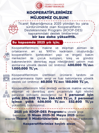 ANKARA, (DHA)- TİCARET Bakanlığı, 2020 yılından bu yana sürdürülen Kooperatiflerin Desteklenmesi Programı (KOOP-DES) kapsamındaki destek limitlerini yükseltti.Bakanlığın sosyal medya hesabından yapılan açıklamaya göre, kooperatiflerin makine ve ekipman alımları ile ortaklarının en az yüzde 90'ını kadınların oluşturduğu kooperatiflerin işletecekleri yaşlı ve engelli bakım merkezleri ile çocuk kulüpleri, kreş ve gündüz bakımevlerinin demirbaş eşya niteliğindeki yatırım malı alımlarına yönelik destek üst limiti 400 bin TL'den 1 milyon TL'ye yükseltildi. Ayrıca, kooperatiflerin ürettikleri ürünlerin tanıtımı ve pazarlanmasına ilişkin sergi ve fuar katılımlarına yönelik destek üst limiti 60 bin TL'den 150 bin TL'ye, hibe desteği verilecek makine veya ekipman ve demirbaş alımı projeleriyle ilgili nitelikli personel istihdamı desteği 1 personel için yıllık 204 bin TL'den 266 bin 400 TL'ye, 2 personel için de yıllık 408 bin TL'den 532 bin 800 TL'ye çıkarıldı. (DHA)