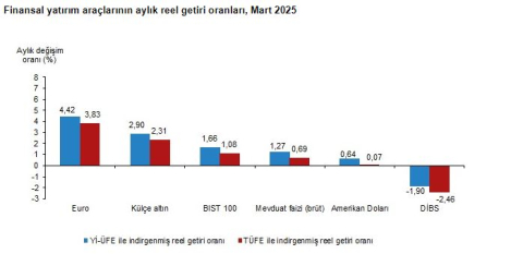 Gizem CENGİL/ANKARA, (DHA)- TÜRKİYE İstatistik Kurumu (TÜİK), martta yatırımcısına aylık en yüksek reel getiri sağlayan finansal yatırım aracının avro olduğunu açıkladı.TÜİK, Mart 2025 dönemine ilişkin finansal yatırım araçlarının reel getiri oranlarını açıkladı. Buna göre; aylık en yüksek reel getiri, yurt içi üretici fiyat endeksi (Yİ-ÜFE) ile indirgendiğinde yüzde 4,42, tüketici fiyat endeksi (TÜFE) ile indirgendiğinde ise yüzde 3,83 oranlarıyla avroda gerçekleşti. Yİ-ÜFE ile indirgendiğinde; yatırım araçlarından külçe altın yüzde 2,90, BIST 100 endeksi yüzde 1,66, mevduat faizi (brüt) yüzde 1,27 ve dolar yüzde 0,64 oranlarında yatırımcısına reel getiri sağlarken; devlet iç borçlanma senetleri (DİBS) yüzde 1,90 oranında yatırımcısına kaybettirdi. TÜFE ile indirgendiğinde; yatırım araçlarından külçe altın yüzde 2,31, BIST 100 endeksi yüzde 1,08, mevduat faizi (brüt) yüzde 0,69 ve dolar yüzde 0,07 oranlarında yatırımcısına reel getiri sağlarken; DİBS yüzde 2,46 oranında yatırımcısına kaybettirdi.Külçe altın, üç aylık değerlendirmede; Yİ-ÜFE ile indirgendiğinde yüzde 10,90, TÜFE ile indirgendiğinde ise yüzde 8,05 oranlarında yatırımcısına en yüksek reel getiri sağlayan yatırım aracı oldu. Aynı dönemde BIST 100 endeksi, Yİ-ÜFE ile indirgendiğinde yüzde 4,95, TÜFE ile indirgendiğinde ise yüzde 7,40 oranlarında yatırımcısına en çok kaybettiren yatırım aracı oldu. Altı aylık değerlendirmeye göre külçe altın; Yİ-ÜFE ile indirgendiğinde yüzde 13,83, TÜFE ile indirgendiğinde ise yüzde 6,83 oranlarında yatırımcısına en yüksek reel getiri sağlayan yatırım aracı olurken; aynı dönemde BIST 100 endeksi, Yİ-ÜFE ile indirgendiğinde yüzde 5,99, TÜFE ile indirgendiğinde ise yüzde 11,77 oranlarında yatırımcısına en çok kaybettiren yatırım aracı oldu.YILLIK EN YÜKSEK GETİRİ KÜLÇE ALTINDAFinansal yatırım araçları yıllık olarak değerlendirildiğinde külçe altın; Yİ-ÜFE ile indirgendiğinde yüzde 22,20, TÜFE ile indirgendiğinde ise yüzde 9,28 oranlarında yatırımcısına en yüksek reel getiri sağlayan yatırım aracı oldu. Yıllık değerlendirmede, Yİ-ÜFE ile indirgendiğinde; yatırım araçlarından mevduat faizi (brüt) yüzde 12,70 ve DİBS yüzde 6,18 oranlarında yatırımcısına reel getiri sağlarken; dolar yüzde 6,23, avro yüzde 6,79 ve BIST 100 endeksi yüzde 8,70 oranlarında yatırımcısına kaybettirdi. TÜFE ile indirgendiğinde mevduat faizi (brüt) yüzde 0,78 oranında yatırımcısına reel getiri sağlarken; DİBS yüzde 5,05, dolar yüzde 16,14, avro yüzde 16,65 ve BIST 100 endeksi yüzde 18,35 oranlarında yatırımcısına kaybettirdi. (DHA)
