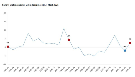 ANKARA, (DHA)- TÜRKİYE İstatistik Kurumu (TÜİK), sanayi üretiminin mart ayında yıllık yüzde 2,5; aylık yüzde 3,4 arttığını açıkladı. TÜİK, Mart 2025 dönemine ilişkin sanayi üretim endeksi verilerini açıkladı. Buna göre; sanayi üretimi bir önceki yılın aynı ayına göre yüzde 2,5 arttı. Sanayinin alt sektörleri incelendiğinde, madencilik ve taş ocakçılığı sektörü endeksi bir önceki yılın aynı ayına göre yüzde 4,9 arttı, imalat sanayi sektörü endeksi yüzde 2 arttı ve elektrik, gaz, buhar ve iklimlendirme üretimi ve dağıtımı sektörü endeksi yüzde 6,1 arttı. Sanayi üretimi, bir önceki aya göre yüzde 3,4 arttı. Alt sektörleri incelendiğinde, madencilik ve taş ocakçılığı sektörü endeksi bir önceki aya göre yüzde 8,2 arttı, imalat sanayi sektörü endeksi yüzde 3,7 arttı ve elektrik, gaz, buhar ve iklimlendirme üretimi ve dağıtımı sektörü endeksi yüzde 3,5 azaldı. (DHA)