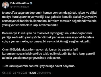 ANKARA, (DHA)- İLETİŞİM Başkanı Fahrettin Altun, İstanbul açıklarında meydana gelen depremle ilgili yapılan yayınlara ilişkin, "Bazı medya kuruluşları maalesef reyting uğruna, vatandaşlarımızı paniğe sevk edip yanlış yönlendirmek pahasına sansasyonel ifadelere çokça yer vermekte, sorumsuz bir yayıncılık örneği sergilemektedir. Önemli ölçüde dezenformasyon da içeren bu yayınlar, ilgili kurumlarımızca sıkı bir şekilde takip edilmektedir" dedi.İletişim Başkanı Altun, Marmara Denizi'nde, Silivri açıklarında meydana gelen 6.2 büyüklüğündeki depremlere ilişkin sosyal medya hesabından açıklama yaptı. Altun, "İstanbul'da yaşanan depremin hemen sonrasında görsel, işitsel ve dijital medya kuruluşlarının yer verdiği bazı şahıslar konu ile alakalı yüzeysel ve sansasyonel ifadeler kullanmakta, birtakım temelsiz değerlendirmelerle yanlış yönlendirmelere kapı aralamaktadır. Bazı medya kuruluşları da maalesef reyting uğruna, vatandaşlarımızı paniğe sevk edip yanlış yönlendirmek pahasına sansasyonel ifadelere çokça yer vermekte, sorumsuz bir yayıncılık örneği sergilemektedir. Önemli ölçüde dezenformasyon da içeren bu yayınlar ilgili kurumlarımızca sıkı bir şekilde takip edilmektedir. Bunlara karşı gerekli adımlar yasalarımız çerçevesinde atılacaktır. Tüm kuruluşlarımızı sorumlu yayıncılığa davet ediyoruz" açıklamalarında bulundu. (DHA)