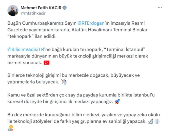 ANKARA, (DHA)- SANAYİ ve Teknoloji Bakanı Mehmet Fatih Kacır, Atatürk Havalimanı terminal binalarının 'teknopark' ilan edildiğini duyurarak, "Bilişim Vadisi'ne bağlı kurulan teknopark, 'Terminal İstanbul' markasıyla dünyanın en büyük teknoloji girişimciliği merkezi olarak hizmet sunacak" dedi.Bakan Kacır, sosyal medya hesabından yaptığı açıklamada, "Bugün Cumhurbaşkanımız Sayın Recep Tayyip Erdoğan'ın imzasıyla Resmi Gazetede yayımlanan kararla, . Bilişim Vadisi'ne bağlı kurulan teknopark, 'Terminal İstanbul' markasıyla dünyanın en büyük teknoloji girişimciliği merkezi olarak hizmet sunacak. Binlerce teknoloji girişimi bu merkezde doğacak, büyüyecek ve yatırımcılarla buluşacak. Kamu ve özel sektörden çok sayıda paydaş kurumla birlikte İstanbul'u küresel düzeyde bir girişimcilik merkezi yapacağız. Bu dev merkezde kuracağımız bilim merkezi, yazılım ve yapay zeka okulu ile teknoloji atölyeleri de farklı yaş gruplarına ev sahipliği yapacak" dedi. (DHA)