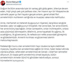 Ali Ekber METE/ANKARA, (DHA)- MHP Genel Başkanı Devlet Bahçeli, "En başta şehit annelerimiz olmak kaydıyla, bütün annelerimizin, Anneler Günü'nü gönülden tebrik ediyor, sonsuz hürmetlerimi sunuyorum" dedi. MHP Genel Başkanı Bahçeli, 'Anneler Günü' vesilesi ile sosyal medya hesabından paylaştığı mesajda, annelerin merhamet ve metanet duygusunun nişanesi olduğunu belirterek, "Doğum ile ölüm arasında tıpkı bir sarkaç gibi gidip gelen, biteviye devam eden, inişli çıkışlı pek çok patikası olan, her insanın ayrı bir hikayesine de sahnelik yapan şu fani hayatın gerçek anlamı, genel ahlaki fikri annelerimizin muhterem varlığında ve muazzez vakarında mahfuzdur. Anne, merhamet ve metanet duygusunun nişanesi, karşılıksız sevgiyle beraber, sabır ve sağduyunun timsalidir. Her anne özel, her anne önemli, her anne övünç kaynağıdır" ifadelerini kullandı. Annelerin kırılması ve gücenmesinin alemin mahzunlaşması olduğunu kaydeden Bahçeli, "Onları üzmeyelim, onları incitmeyelim, onlara asla yüzümüzü dönmeyelim. Bilelim ki anne hayattaki ilk ışığımız, ilk sıcaklığımız, ilk güvencemiz, ilk nefesle son nefes arasındaki güneşimiz ve güldestemizdir. Fedakarlığın burcu olan annelerimizin hayır dualarına layık olabilmek niyazıyla, hayatta olan annelerimize sağlıklı bir ömür, halen tedavi altında olanlara şifalar, vefat eden annelerimize de Cenab-ı Allah'tan rahmetler diliyorum. En başta şehit annelerimiz olmak kaydıyla, bütün annelerimizin Anneler Günü'nü gönülden tebrik ediyor, sonsuz hürmetlerimi sunuyorum" dedi. (DHA)