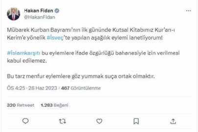 Bakan Fidan, Twitter hesabından açıklama yaptı. Fidan, "Mübarek Kurban Bayramı’nın ilk gününde kutsal kitabımız Kur’an-ı Kerim’e yönelik İsveç’te yapılan aşağılık eylemi lanetliyorum. İslam karşıtı bu eylemlere ifade özgürlüğü bahanesiyle izin verilmesi kabul edilemez. Bu tarz menfur eylemlere göz yummak suça ortak olmaktır" ifadelerini kullandı. (DHA)