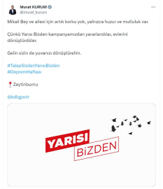 ANKARA, (DHA)- ÇEVRE, Şehircilik ve İklim Değişikliği Bakanı Murat Kurum, İstanbul'un kentsel dönüşümü için başlatılan Yarısı Bizden Kampanyası'na ilişkin, "Mikail Bey ve ailesi için artık korku yok, yalnızca huzur ve mutluluk var. Çünkü Yarısı Bizden kampanyamızdan yararlandılar, evlerini dönüştürdüler. Gelin sizin de yuvanızı dönüştürelim" dedi.Bakanlıktan yapılan yazılı açıklamaya göre; Çevre, Şehircilik ve İklim Değişikliği Bakanlığı, acil dönüşüme ihtiyaç duyulan İstanbul için 'Yarısı Bizden' desteğini sürdürüyor. 600 bin riskli konut ve iş yerinin bulunduğu kentte evini yenilemek isteyenlere her bir konut için 700 bin TL hibe, 700 bin TL kredi ve 100 bin TL taşınma desteği veriliyor. İlk yıl faiz uygulanmayan kredi geri ödemeleri, yapı ruhsatı alındıktan 2 yıl sonra başlıyor ve 10 yıl vadeye yayılıyor. Yine Yarısı Bizden Kampanyası kapsamında alan bazlı büyük dönüşümlerde 700 bin TL'lik hibe desteği sağlanıyor. İnşaatları TOKİ ya da Emlak Konut GYO üstleniyor. Hibe tutarı bina maliyetinden düşürülüyor, arta kalan borçsa yine uzun vadeli uygun ödeme koşullarıyla taksitlendiriliyor. İstanbul'da 15 bin ev ve iş yerinin Yarısı Bizden ile dönüşümü sürüyor.KELEŞ AİLESİNDEN TEŞEKKÜR26 Nisan 2023'te başlatılan kampanya kapsamında vatandaşlar yeni ve depreme dayanıklı konutlarına kavuşuyor. Çevre, Şehircilik ve İklim Değişikliği Bakanı Murat Kurum, Zeytinburnu'nda yenilenen evlerine taşınan vatandaşların görüntülerini sosyal medya hesabından paylaşarak, "Mikail Bey ve ailesi için artık korku yok, yalnızca huzur ve mutluluk var. Çünkü Yarısı Bizden kampanyamızdan yararlandılar, evlerini dönüştürdüler. Gelin sizin de yuvanızı dönüştürelim" dedi. Mikail Keleş ve ailesi de artık evlerinde güvenle oturduklarını belirterek, vatandaşları kampanyadan faydalanmaya davet etti. (DHA)