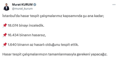 ANKARA, (DHA)- ÇEVRE, Şehircilik ve İklim Değişikliği Bakanı Murat Kurum, İstanbul'da hasar tespit çalışmalarının devam ettiğini belirterek, 1640 binanın az hasarlı olduğunu açıkladı.İstanbul'da 6.2 büyüklüğündeki depremin ardından Yapı İşleri Genel Müdürlüğü ekipleri 39 ilçe ve 963 mahallede hasar tespit çalışmalarına devam ediyor. Çevre, Şehircilik ve İklim Değişikliği Bakanı Murat Kurum, çalışmalardaki son duruma ilişkin sosyal medya yaptığı açıklamada, "İstanbul'da hasar tespit çalışmalarımız kapsamında şu ana kadar; 18 bin 74 binayı inceledik. 16 bin 434 binanın hasarsız, 1640 binanın az hasarlı olduğunu tespit ettik. Hasar tespit çalışmalarımızın tamamlanmasıyla gerekeni yapacağız" ifadelerini kullandı. (DHA)