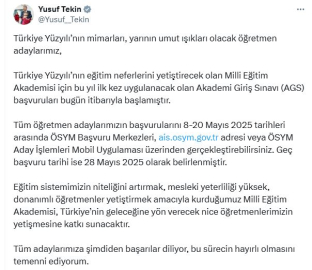 ANKARA, (DHA)- MİLLİ Eğitim Bakanı Yusuf Tekin, Milli Eğitim Akademisi için bu yıl ilk kez uygulanacak olan Akademi Giriş Sınavı (AGS) başvurularının başladığını açıkladı.Milli Eğitim Bakanı Yusuf Tekin, sosyal medya hesabından yaptığı açıklamada, "'Türkiye Yüzyılı'nın mimarları, yarının umut ışıkları olacak öğretmen adaylarımız; 'Türkiye Yüzyılı'nın eğitim neferlerini yetiştirecek olan Milli Eğitim Akademisi için bu yıl ilk kez uygulanacak olan Akademi Giriş Sınavı başvuruları bugün itibarıyla başlamıştır. Tüm öğretmen adaylarımızın başvurularını 8-20 Mayıs 2025 tarihleri arasında ÖSYM Başvuru Merkezleri, https://ais.osym.gov.tr adresi veya ÖSYM Aday İşlemleri Mobil Uygulaması üzerinden gerçekleştirebilirsiniz. Geç başvuru tarihi ise 28 Mayıs 2025 olarak belirlenmiştir" ifadelerini kullandı. Milli Eğitim Akademisi'nin, eğitim sisteminin niteliğini artırmak, mesleki yeterliliği yüksek, donanımlı öğretmenler yetiştirmek amacıyla kurulduğunu aktaran Tekin, "Türkiye'nin geleceğine yön verecek nice öğretmenlerimizin yetişmesine katkı sunacaktır. Tüm adaylarımıza şimdiden başarılar diliyor, bu sürecin hayırlı olmasını temenni ediyorum" dedi. (DHA)