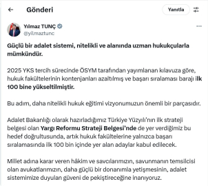 Eda KOÇ/ANKARA, (DHA)- ADALET Bakanı Yılmaz Tunç, "Artık hukuk fakültelerine yalnızca başarı sıralamasında ilk 100 bin içinde yer alan adaylar kabul edilecek. Millet adına karar veren hakim ve savcılarımızın, savunmanın temsilcisi olan avukatlarımızın, daha güçlü bir donanımla yetişmesinin, adalet sistemimize duyulan güveni de pekiştireceğine inanıyoruz" dedi.Bakan Tunç, sosyal medya hesabından yaptığı açıklamada, "Güçlü bir adalet sistemi, nitelikli ve alanında uzman hukukçularla mümkündür. 2025 YKS tercih sürecinde ÖSYM tarafından yayımlanan kılavuza göre, hukuk fakültelerinin kontenjanları azaltılmış ve başarı sıralaması barajı ilk 100 bine yükseltilmiştir. Bu adım, daha nitelikli hukuk eğitimi vizyonumuzun önemli bir parçasıdır. Adalet Bakanlığı olarak hazırladığımız Türkiye Yüzyılı'nın ilk strateji belgesi olan Yargı Reformu Strateji Belgesi'nde de yer verdiğimiz bu hedef doğrultusunda, artık hukuk fakültelerine yalnızca başarı sıralamasında ilk 100 bin içinde yer alan adaylar kabul edilecek. Millet adına karar veren hakim ve savcılarımızın, savunmanın temsilcisi olan avukatlarımızın, daha güçlü bir donanımla yetişmesinin, adalet sistemimize duyulan güveni de pekiştireceğine inanıyoruz. Bu ideal doğrultusunda tercihlerini yapacak olan geleceğin hukukçularına şimdiden başarılar diliyorum" dedi. (DHA)