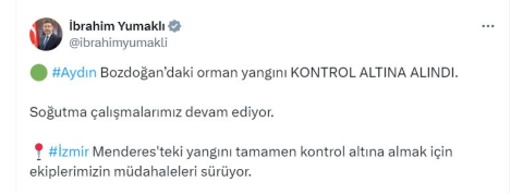 ANKARA, (DHA)- TARIM ve Orman Bakanı İbrahim Yumaklı, Aydın Bozdoğan'daki orman yangınının kontrol altına alındığını duyurdu.Bakan Yumaklı, sosyal medya hesabından yaptığı açıklamada, "Aydın Bozdoğan'daki orman yangını kontrol altına alındı. Soğutma çalışmalarımız devam ediyor. İzmir Menderes'teki yangını tamamen kontrol altına almak için ekiplerimizin müdahaleleri sürüyor" dedi. (DHA)