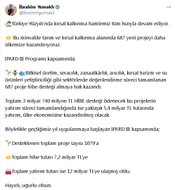 ANKARA, (DHA)- TARIM ve Orman Bakanı İbrahim Yumaklı, IPARD 3 Programı kapsamında 687 projenin hibe desteği almaya hak kazandığını açıkladı.Tarım ve Orman Bakanı İbrahim Yumaklı, sosyal medya hesabından yaptığı açıklamada, "'Türkiye Yüzyılı'nda kırsal kalkınma hamlemiz tüm hızıyla devam ediyor. Bu minvalde tarım ve kırsal kalkınma alanında 687 yeni projeyi daha ülkemize kazandırıyoruz. IPARD 3 Programı kapsamında; bitkisel üretim, seracılık, zanaatkarlık, arıcılık, kırsal turizm ve su ürünleri yetiştiriciliği gibi sektörlerde değerlendirme süreci tamamlanan 687 proje hibe desteği almaya hak kazandı. Toplam 3 milyar 740 milyon TL hibe desteği ödenecek bu projelerin yatırım süreci tamamlandığında ise yaklaşık 5,4 milyar TL tutarında yatırım, ülke ekonomisine kazandırılmış olacak. Böylelikle geçtiğimiz yıl uygulanmaya başlayan IPARD 3 kapsamında; desteklenen toplam proje sayısı 1079'a, toplam hibe tutarı 7,2 milyar TL'ye, toplam yatırım tutarı ise 12 milyar TL'ye ulaşmış oldu. Hayırlı, uğurlu olsun" ifadelerini kullandı. (DHA)