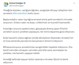 ANKARA, (DHA)- CUMHURBAŞKANI Recep Tayyip Erdoğan'ın eşi Emine Erdoğan, 'Anneler Günü' nedeniyle sosyal medya hesabından yaptığı paylaşımda, şehit annelerini minnetle anarak, Filistinli annelerin acısını yürekten paylaştığını bildirdi.Emine Erdoğan, sosyal medya hesabından yaptığı paylaşımda, "Yüreğiyle büyüten, varlığıyla öğreten, sevgisiyle dünyayı iyileştiren tüm annelerin Anneler Günü kutlu olsun. Başta evladını vatan toprağına emanet etmiş şehit annelerini minnetle anıyorum. Onların sabrı ve duası, milletimizin en kıymetli hazinesidir. İnsanlığın onurunu ayakta tutan, gözyaşıyla direniş yazan Filistinli annelerin acısını yürekten paylaşıyor, her birine dayanma gücü diliyorum" dedi.Erdoğan ayrıca, "Evlat hasretini yıllara rağmen ümide dönüştüren Diyarbakır Anneleri'nin en kısa zamanda yavrularına kavuşmasını temenni ediyorum. Bilhassa koruyucu annelerimize canıgönülden teşekkür ediyorum. Zira kendi canından olmayanı canından aziz bilip sarıp sarmalayan bu yürekler, merhametin yaşayan halidir. Anneliği kalbinde taşıyan bütün kadınların Anneler Günü"nü tebrik ediyorum" ifadelerini kullandı. (DHA)