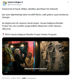 ANKARA, (DHA)- CUMHURBAŞKANI Recep Tayyip Erdoğan'ın eşi Emine Erdoğan, dün katıldığı Türkiye İş Kadınları Derneği'nin (TİKAD) 'Hayata Bağlayan İlmekler' projesi tanıtım programına ilişkin paylaşımda bulundu.Emine Erdoğan, sosyal medya hesabından yaptığı paylaşımda, "İnanıyorum ki hayat; ektikçe, işledikçe güzelleşen bir bahçedir. İşin içine diğerkamlığı katan incelikli fikirler, vakti gelince çiçek tarlalarına dönüşür. Bu düşüncenin bir nişanesi olarak doğan 'Hayata Bağlayan İlmekler Projesi'nin, nice yeniden ayağa kalkma hikayesine vesile olmasını diliyorum" dedi. (DHA)