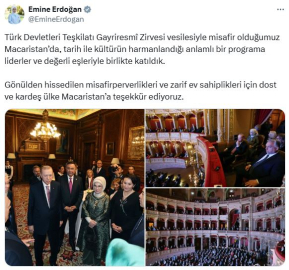 ANKARA, (DHA)- CUMHURBAŞKANI Recep Tayyip Erdoğan'ın eşi Emine Erdoğan, Macaristan'da katıldıkları kültürel programa ilişkin paylaşımda bulundu.Sosyal medya hesabından paylaşım yapan Emine Erdoğan, Türk Devletleri Teşkilatı Gayriresmi Zirvesi vesilesiyle misafir oldukları Macaristan'da, tarih ile kültürün harmanlandığı anlamlı bir programa liderler ve değerli eşleriyle birlikte katıldıklarını kaydetti. Emine Erdoğan, paylaşımında, "Gönülden hissedilen misafirperverlikleri ve zarif ev sahiplikleri için dost ve kardeş ülke Macaristan'a teşekkür ediyoruz" ifadesini kullandı. (DHA)