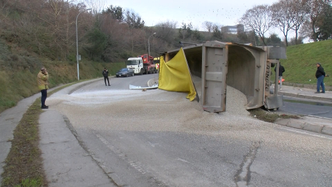 Murat SOLAK / İSTANBUL, (DHA) –KADIKÖY’de şoförünün direksiyon hakimiyetini kaybettiği mıcır yüklü hafriyat kamyonu, virajı alamayarak devrildi. Kamyon şoförünün hafif yaralandığı kazada dökülen mıcır nedeniyle yol bir süre trafiğe kapandı. Kaza, saat 09.00 sıralarında Merdivenköy Mahallesi, Şair Arşi Caddesi'nde meydana geldi. İddiaya göre; Menderes Özdemir'in kontrolündeki 34 GA 8185 plakalı hafriyat kamyonu, Fikirtepe kentsel dönüşüm alanı yolunda virajı döndüğü sırada şoförünün direksiyon hakimiyetini kaybetmesi sonucu devrildi. İhbar üzerine olay yerine itfaiye, polis ve sağlık ekipleri sevk edildi. Kazada kamyon şoförü Özdemir hafif yaralanırken, kamyonda yüklü mıcır yola döküldü. Olay yerine gelen sağlık ekipleri hafif yaralı şoförün tedavisini yaparken polis ekipleri dökülen mıcır nedeniyle kapanan yolda güvenlik önlemi aldı. Kamyonun vinç yardımıyla yoldan kaldırılması ve mıcırın yoldan temizlenmesiyle trafik yeniden açıldı. Polis, kazayla ilgili inceleme başlattı. (DHA)