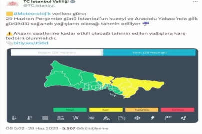 İstanbul Valiliği sosyal medya hesabından yaptığı açıklama ile yarın için İstanbul'un kuzeyi ve Anadolu Yakası için sağanak yağış uyarısında bulundu. Yapılan açıklamada, "Meteorolojik verilere göre; 29 Haziran Perşembe günü İstanbul'un kuzeyi ve Anadolu Yakası'nda gök gürültülü sağanak yağışların olacağı tahmin ediliyor. Akşam saatlerine kadar etkili olacağı tahmin edilen yağışlara karşı tedbirli olunmalıdır" denildi.