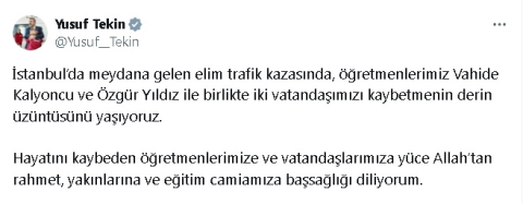 BAKAN TEKİN'DEN TAZİYE MESAJIMilli Eğitim Bakanı Yusuf Tekin, sosyal medya hesabından yaptığı paylaşımda, "İstanbul’da meydana gelen elim trafik kazasında, öğretmenlerimiz Vahide Kalyoncu ve Özgür Yıldız ile birlikte iki vatandaşımızı kaybetmenin derin üzüntüsünü yaşıyoruz. Hayatını kaybeden öğretmenlerimize ve vatandaşlarımıza yüce Allah’tan rahmet, yakınlarına ve eğitim camiamıza başsağlığı diliyorum" ifadelerini kullandı. (DHA)ANKARA, (DHA)